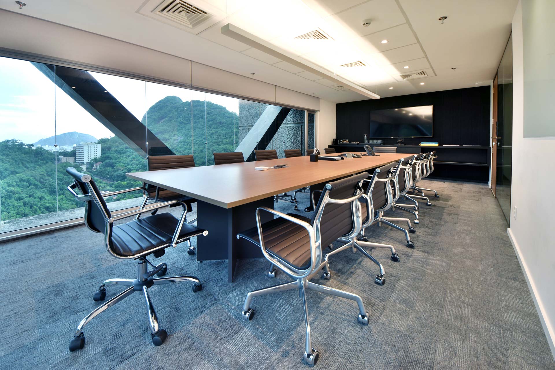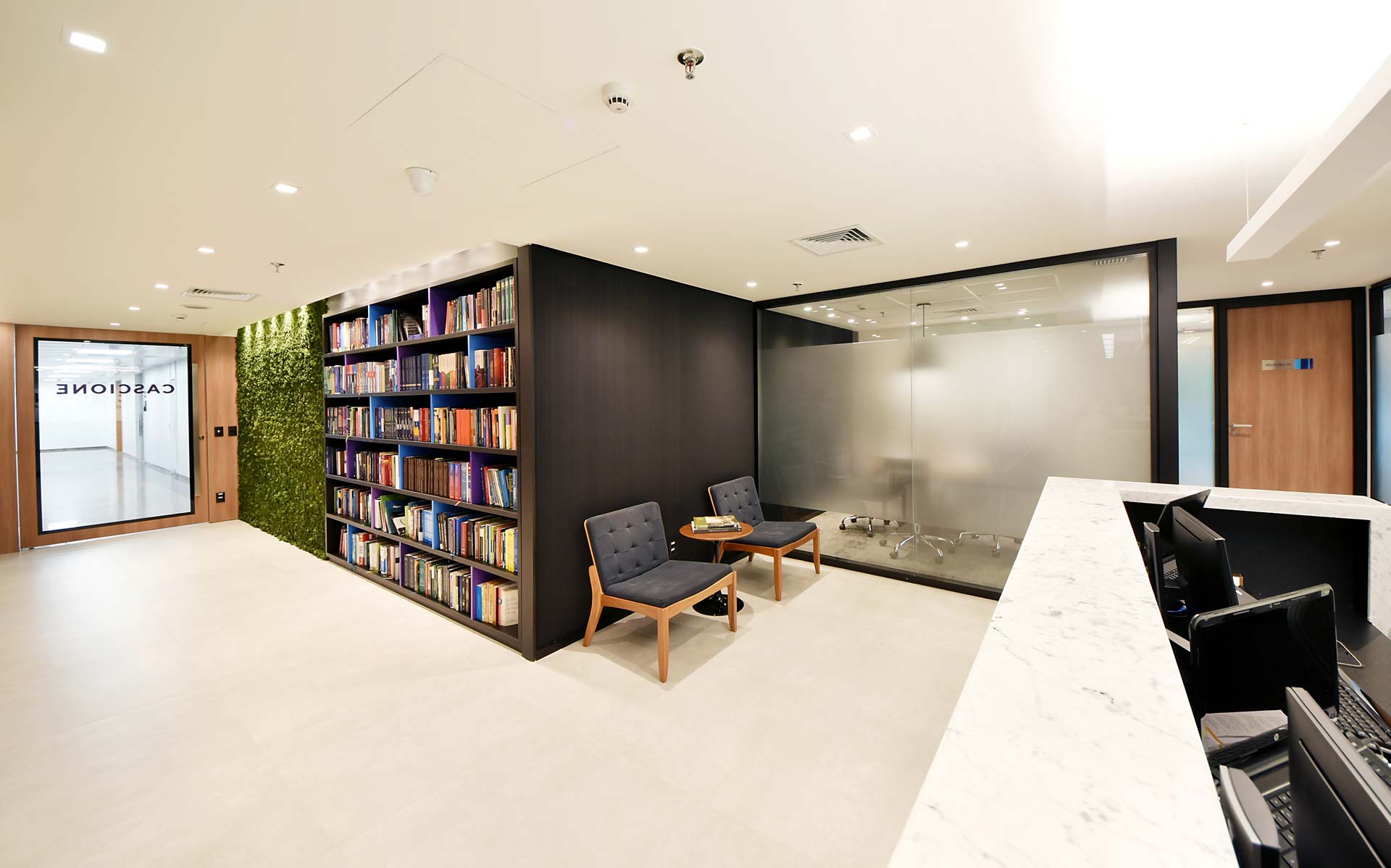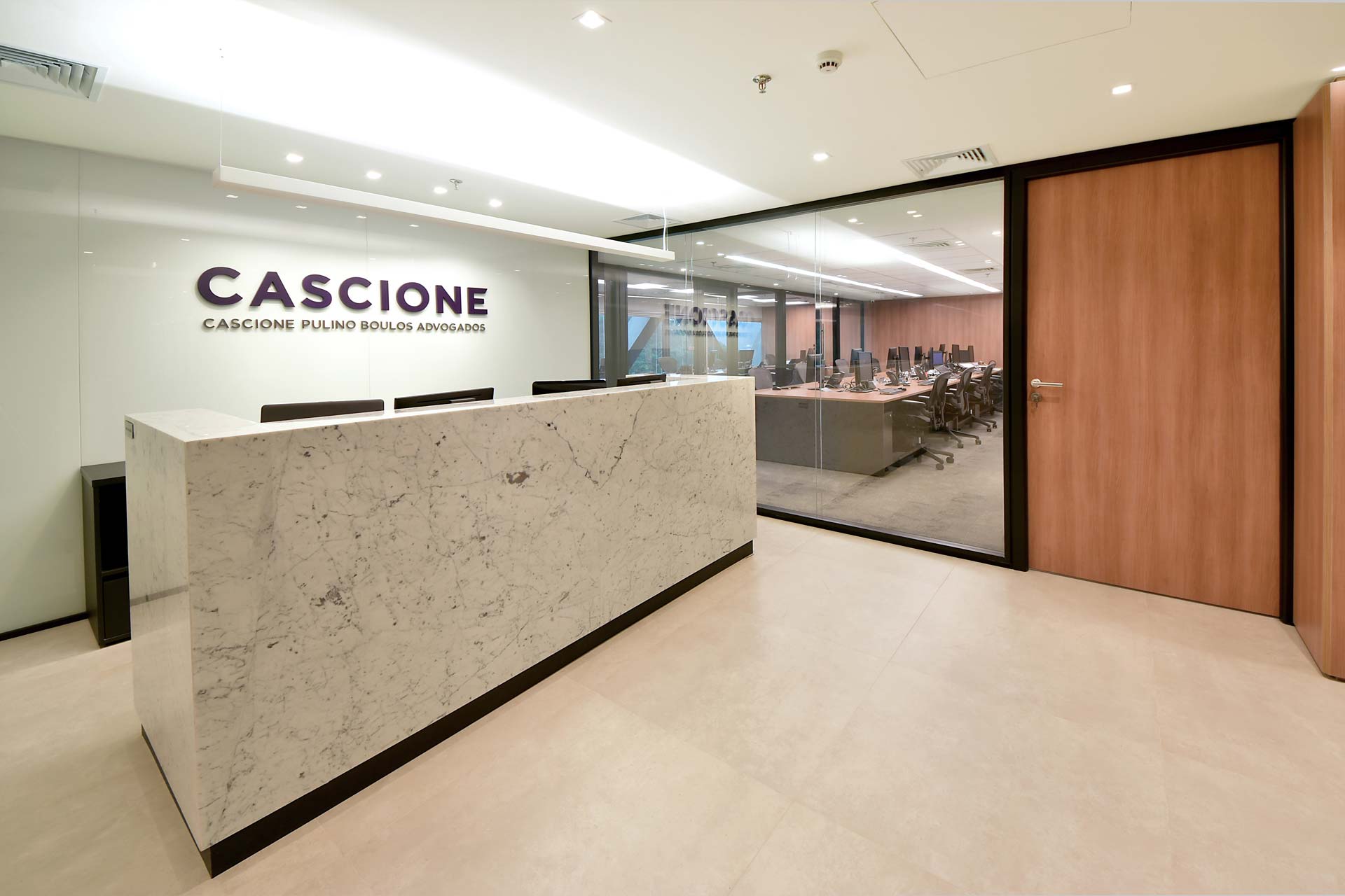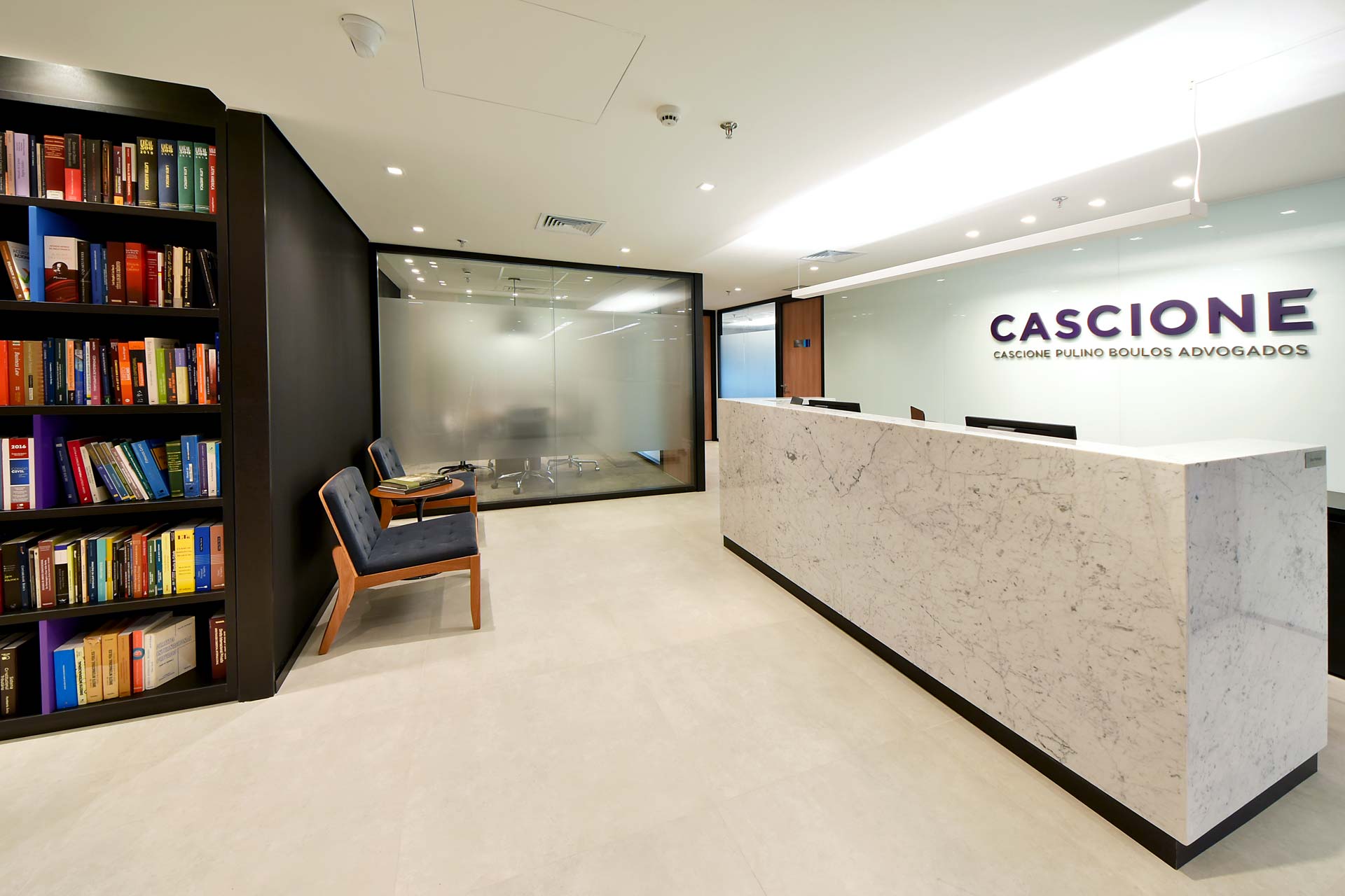 O projeto arquitetônico para os 300m² do escritório da Cascione Advogados na Torre do Rio Sul, no Rio de Janeiro, foi desenvolvido pelo Leblon Arquitetura.