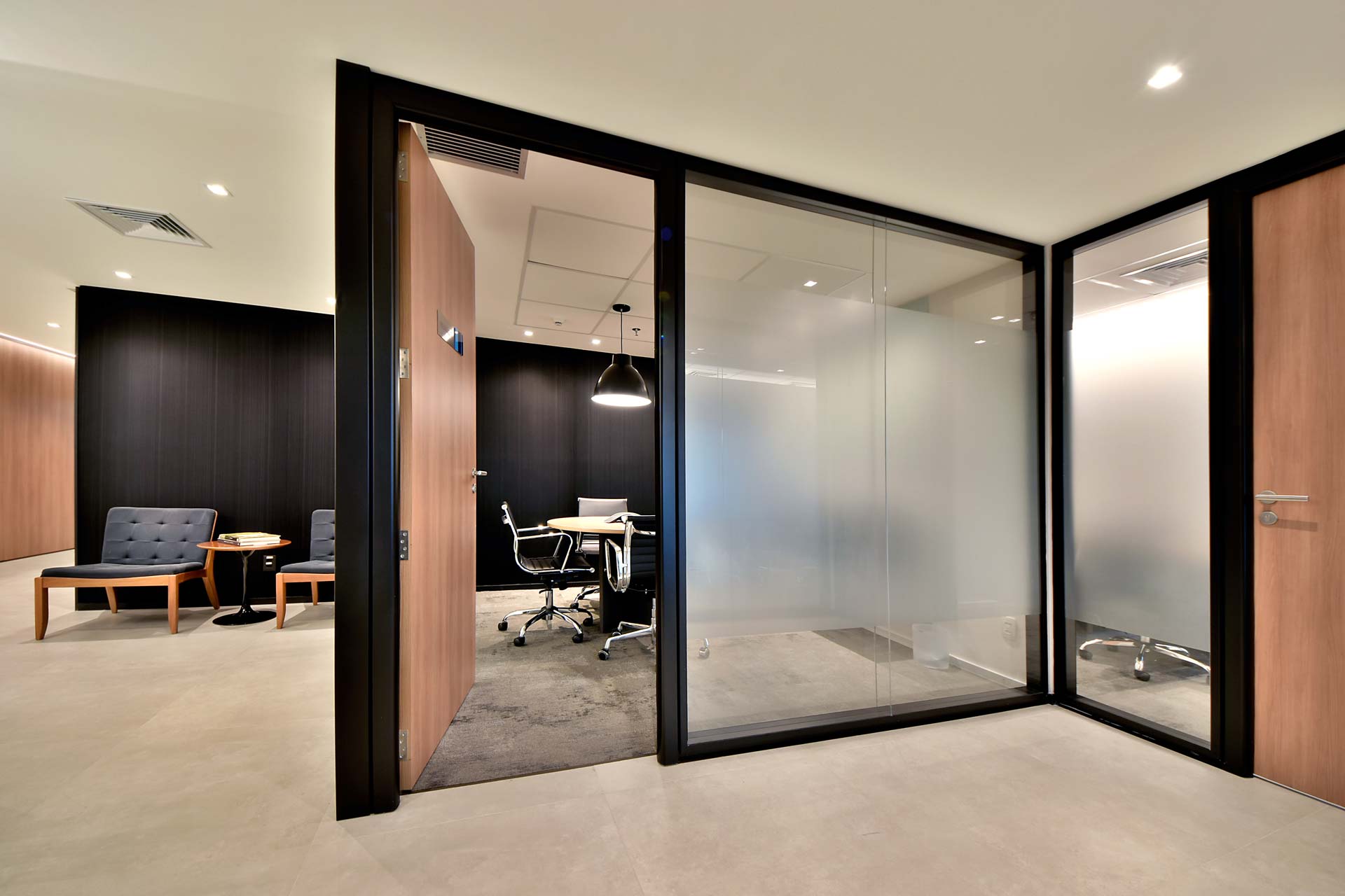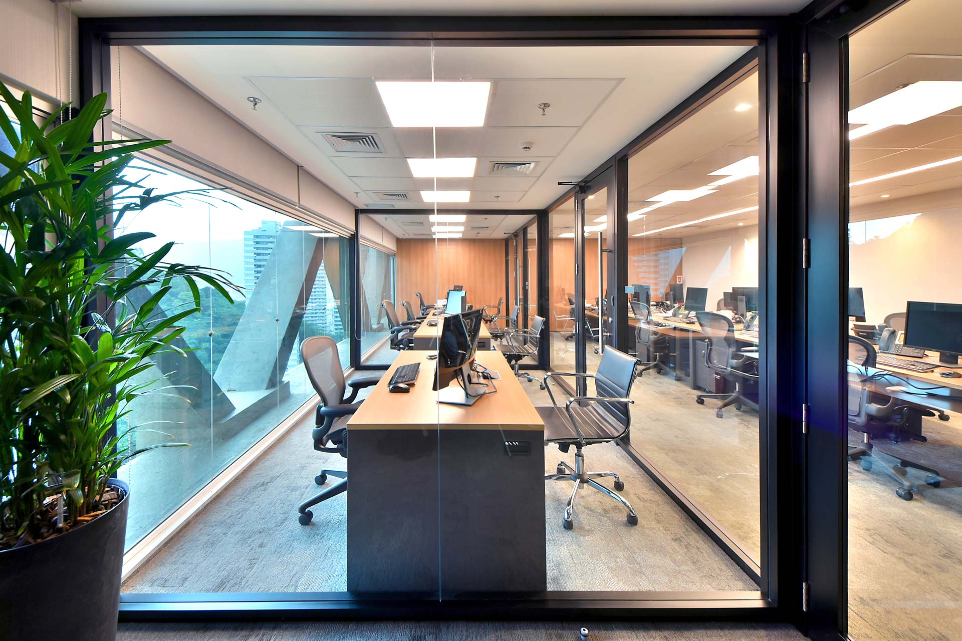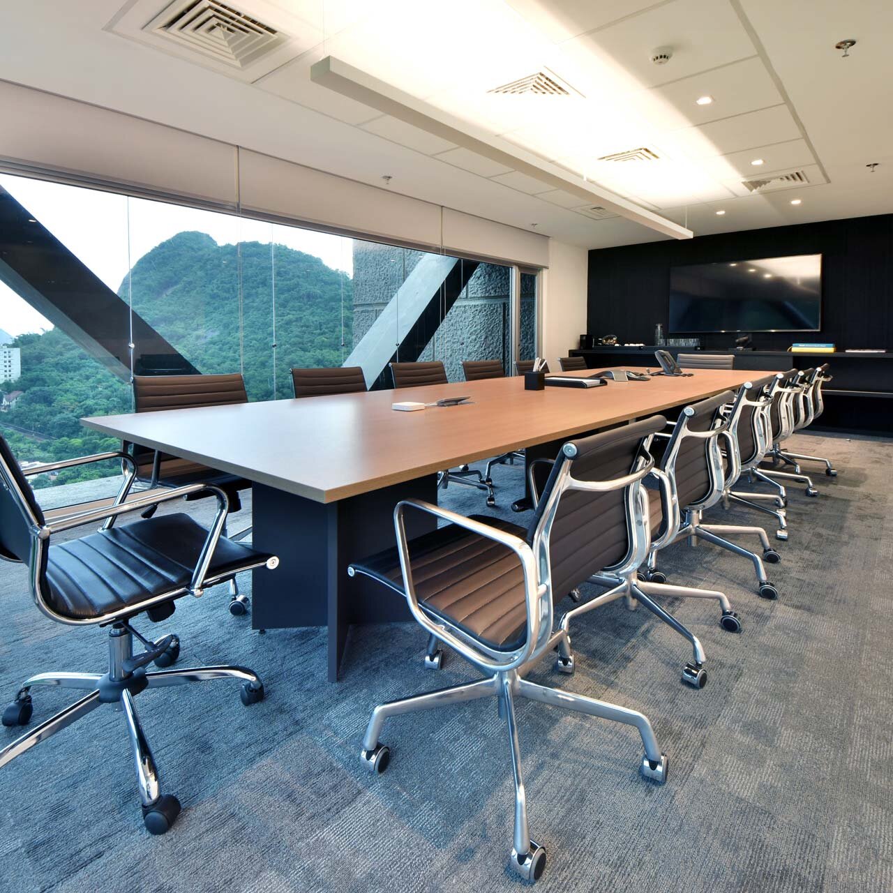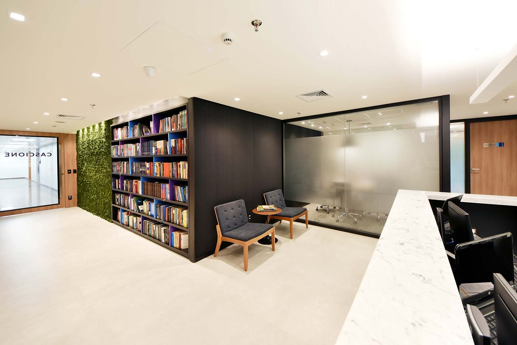 O projeto arquitetônico para os 300m² do escritório da Cascione Advogados na Torre do Rio Sul, no Rio de Janeiro, foi desenvolvido pelo Leblon Arquitetura.