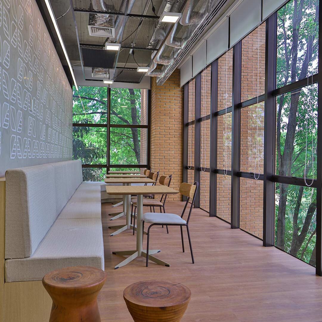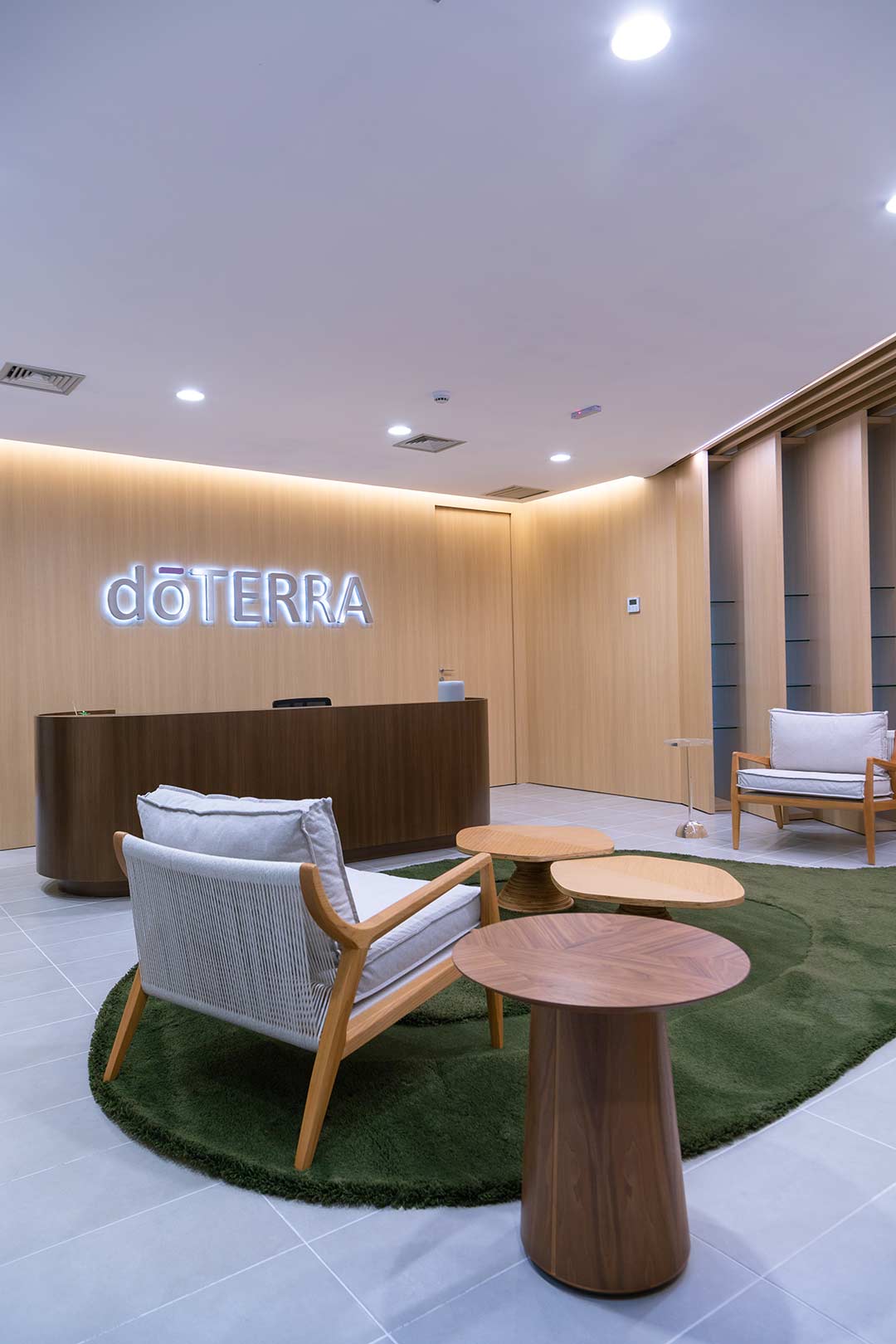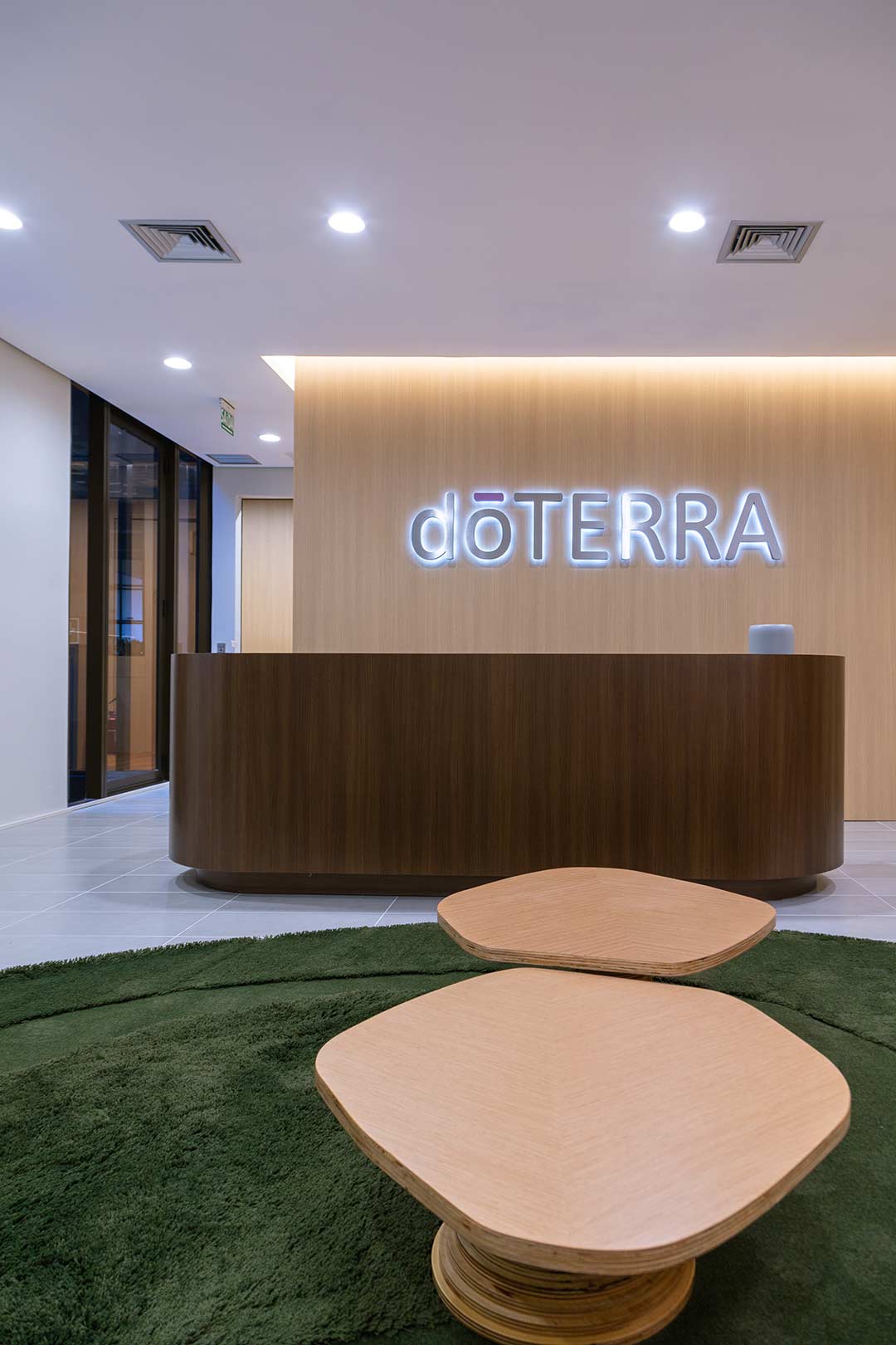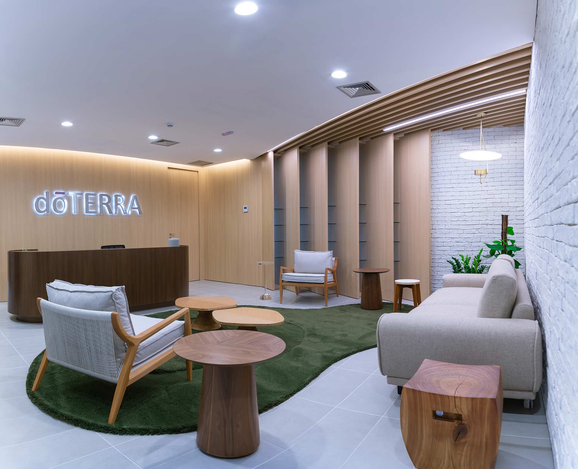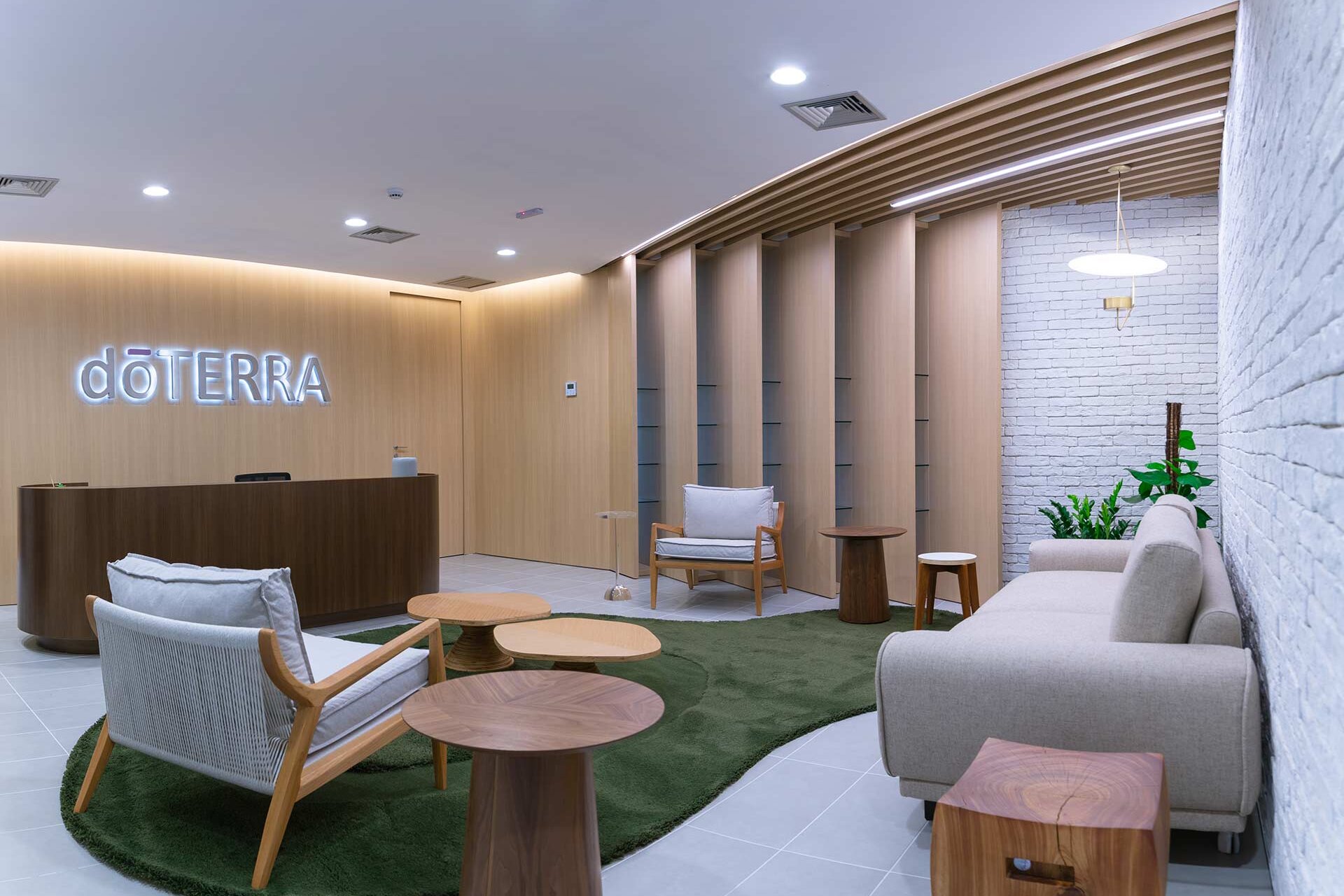 Projetado pela Pitá e ocupando todo o 2º pavimento de um edifício rodeado pelo verde das árvores e jardins, o escritório da dōTerra se expande por uma área de 1150m² na região empresarial de Alphaville (Barueri/SP).
