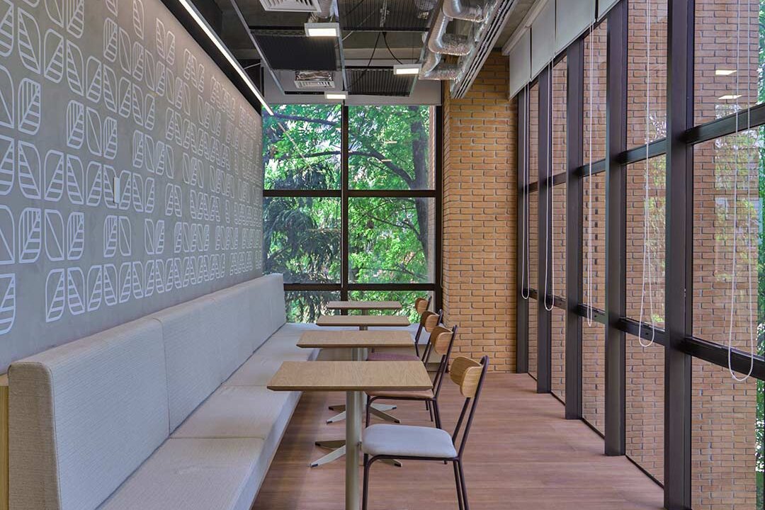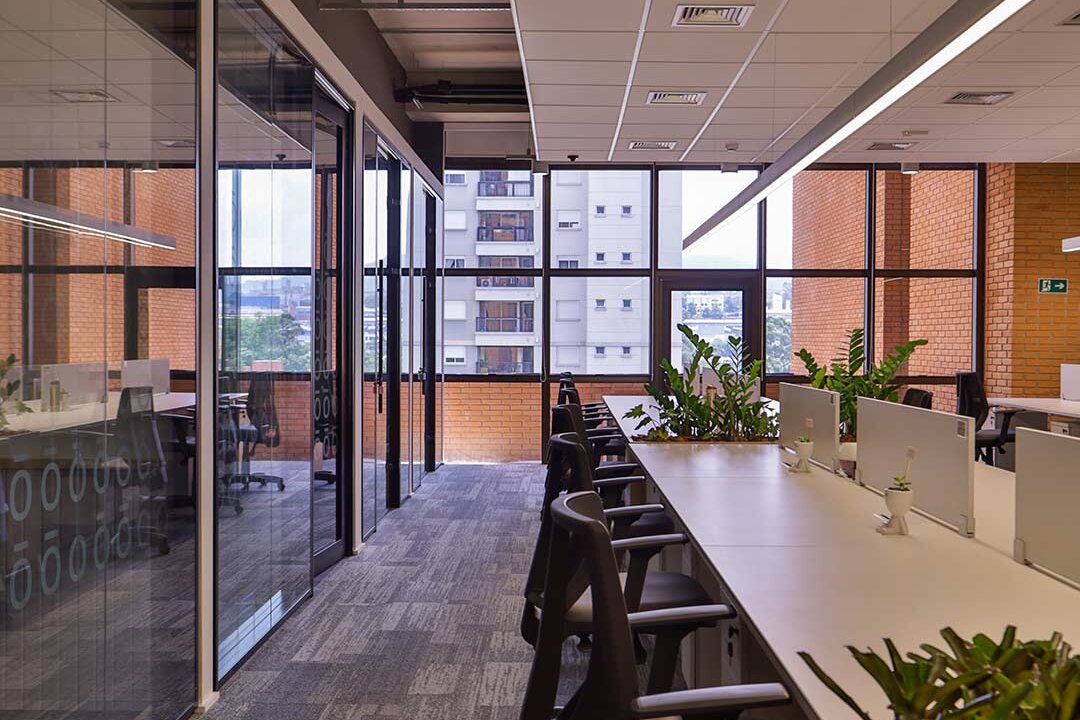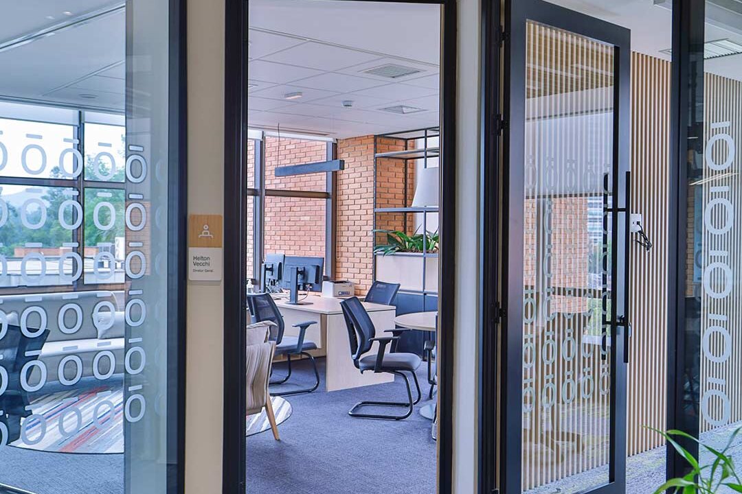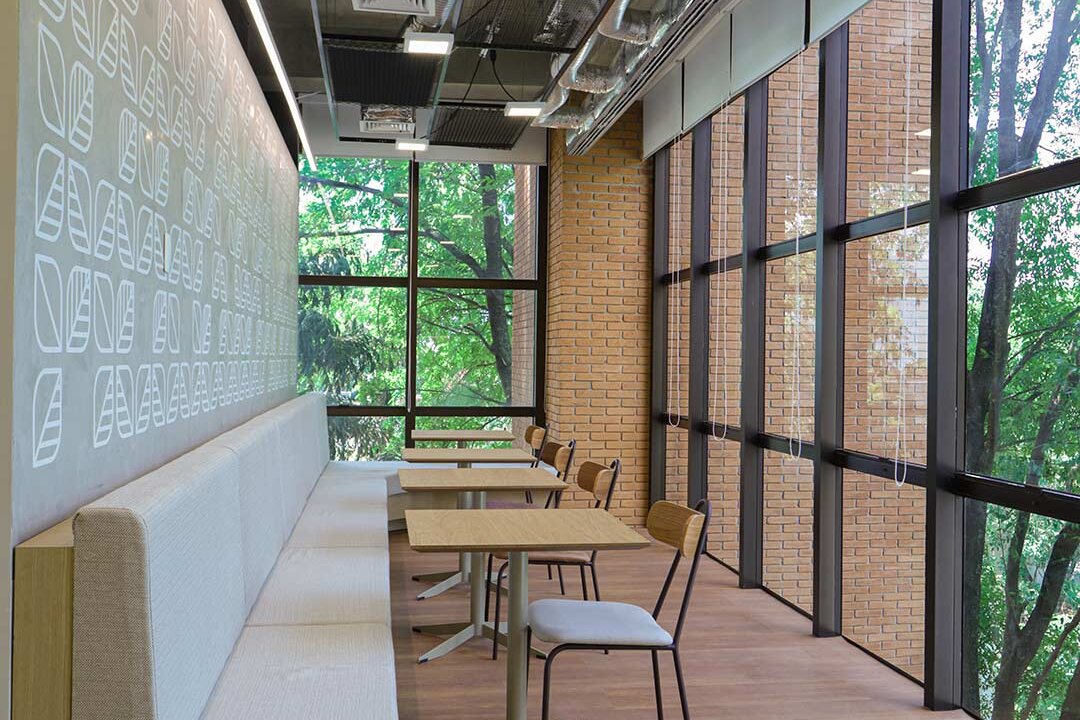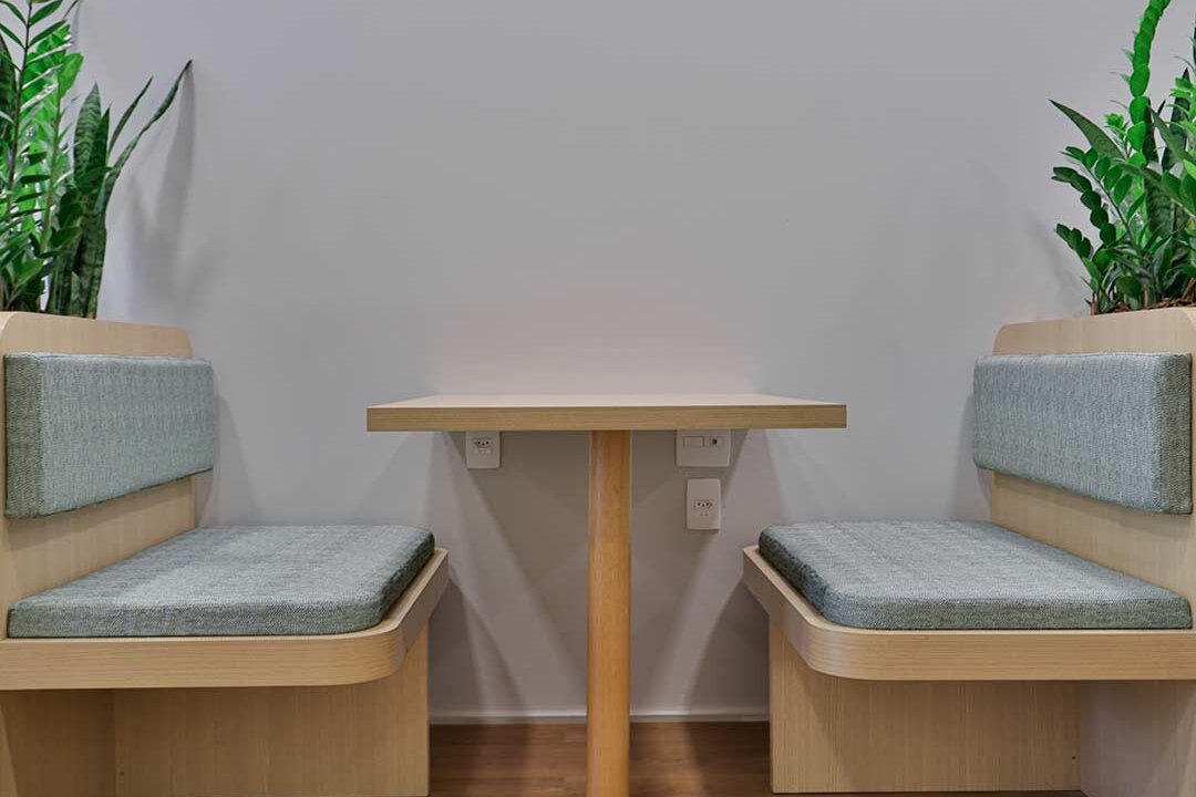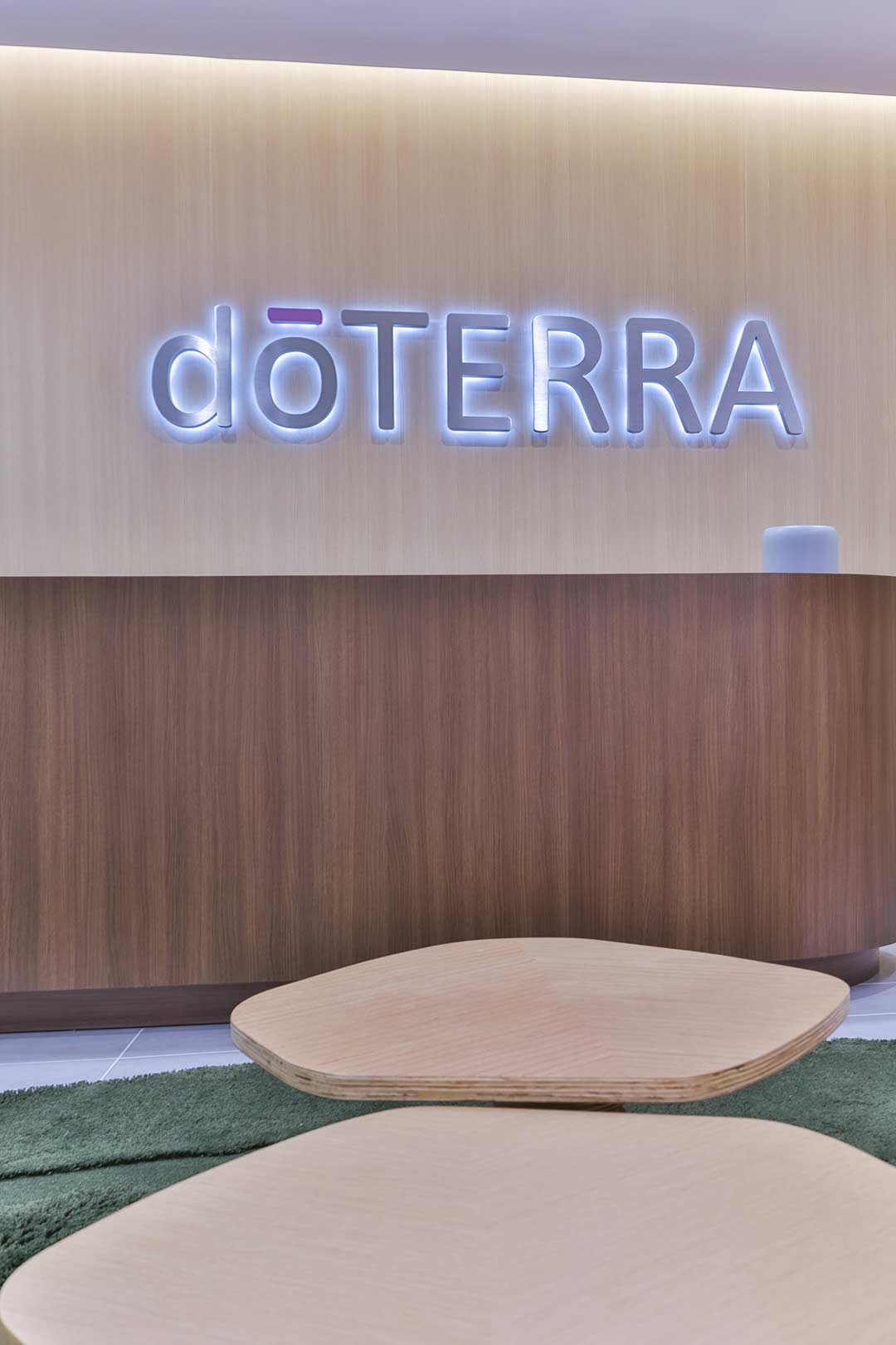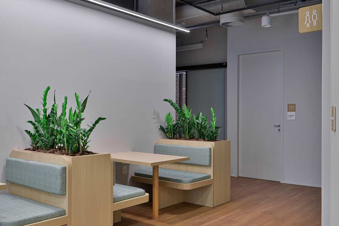 Projetado pela Pitá e ocupando todo o 2º pavimento de um edifício rodeado pelo verde das árvores e jardins, o escritório da dōTerra se expande por uma área de 1150m² na região empresarial de Alphaville (Barueri/SP).