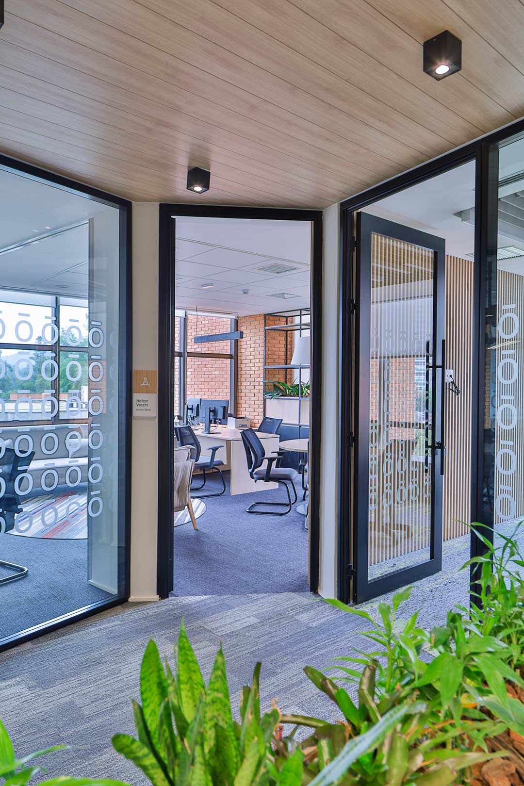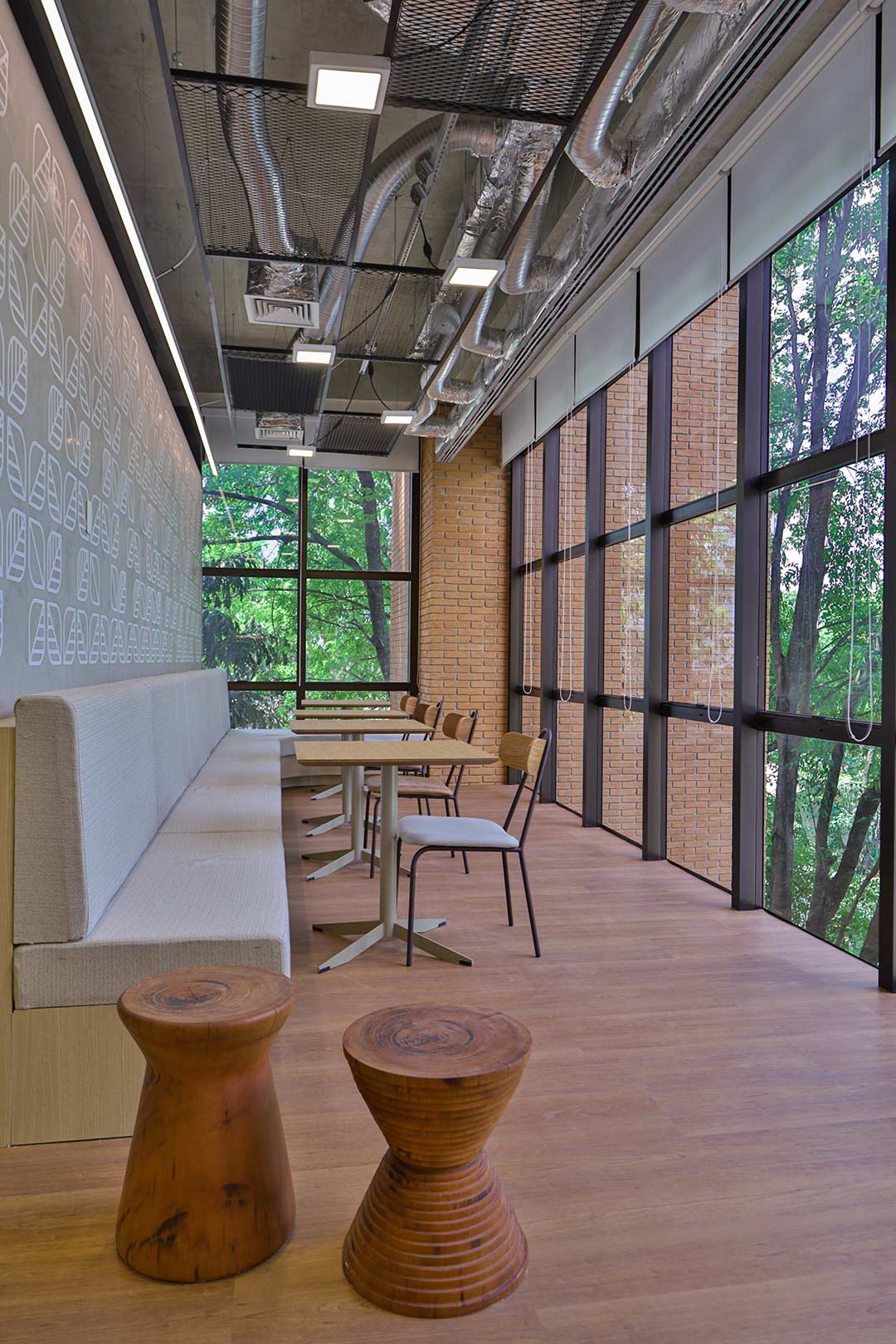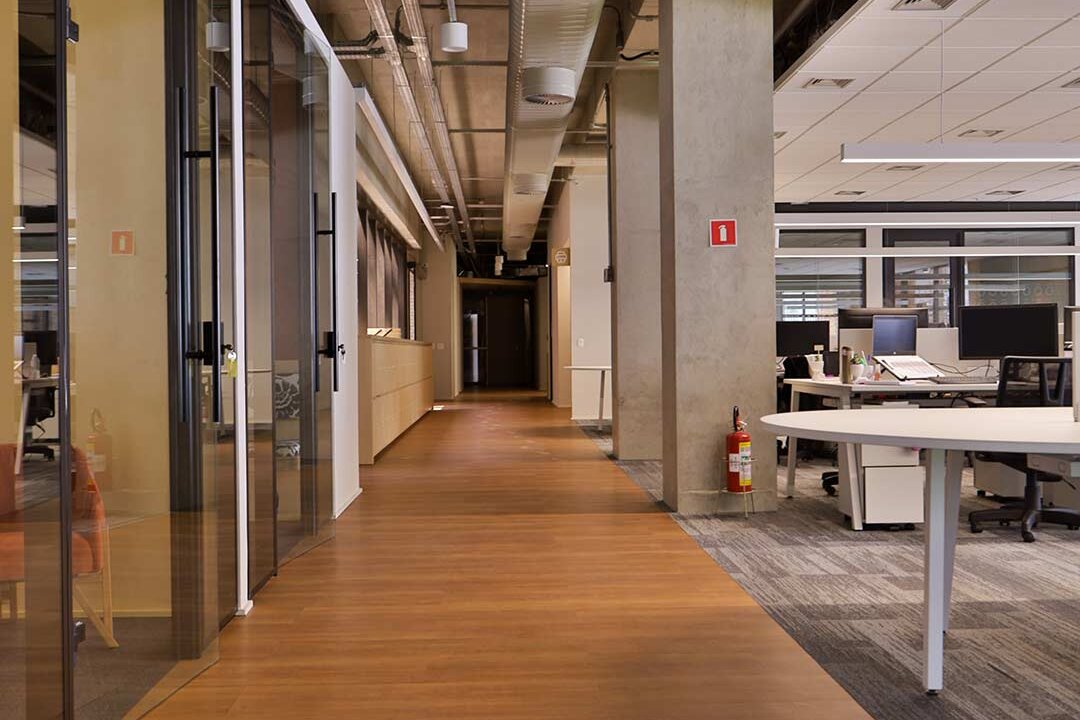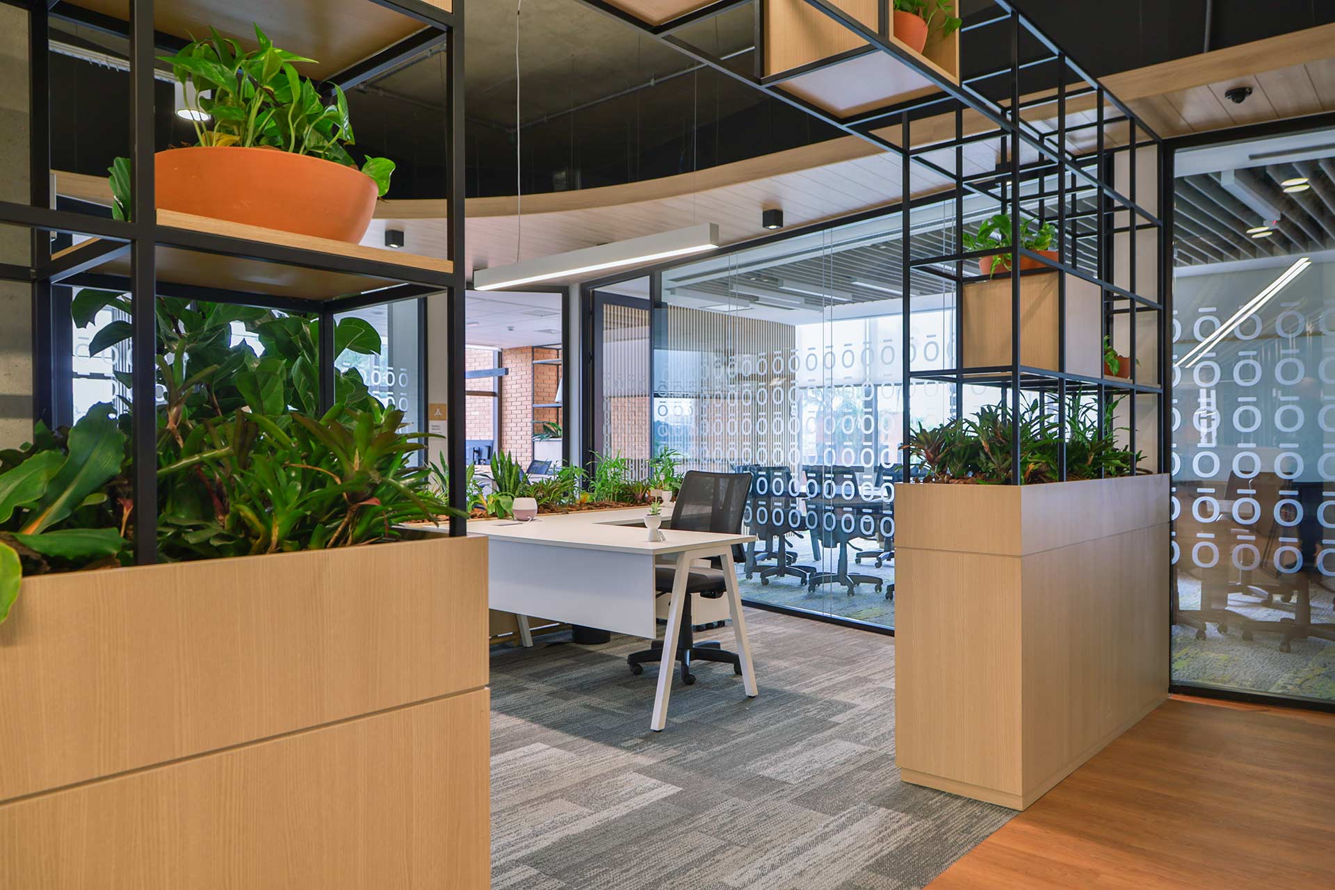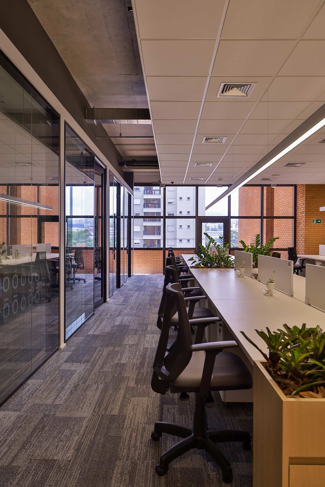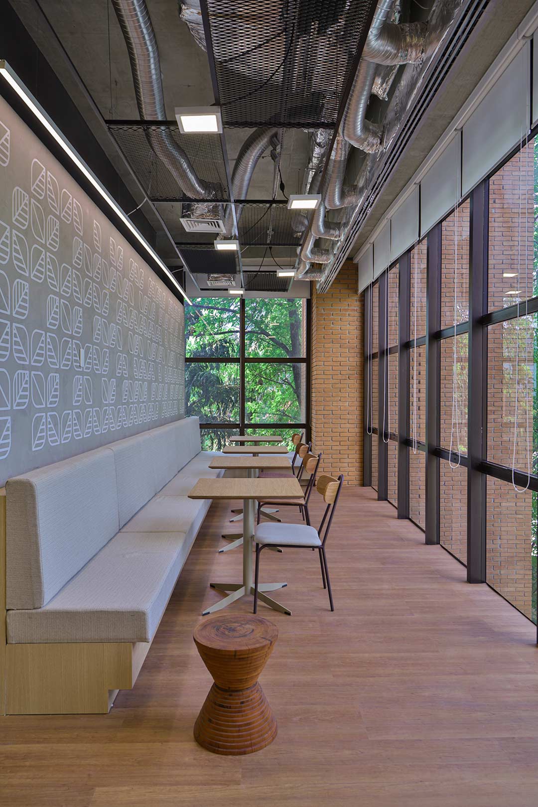 Projetado pela Pitá e ocupando todo o 2º pavimento de um edifício rodeado pelo verde das árvores e jardins, o escritório da dōTerra se expande por uma área de 1150m² na região empresarial de Alphaville (Barueri/SP).
