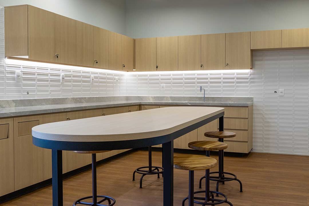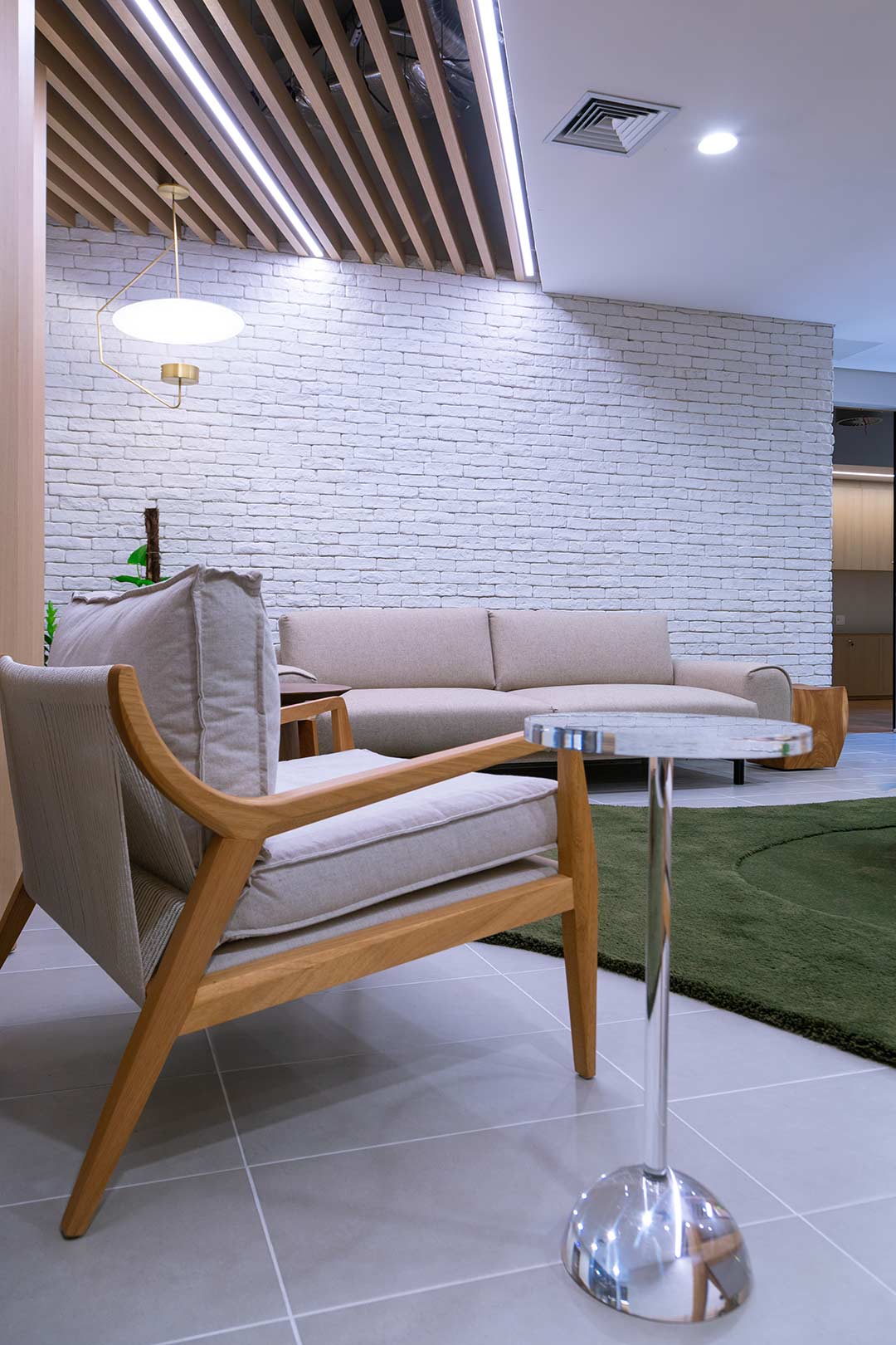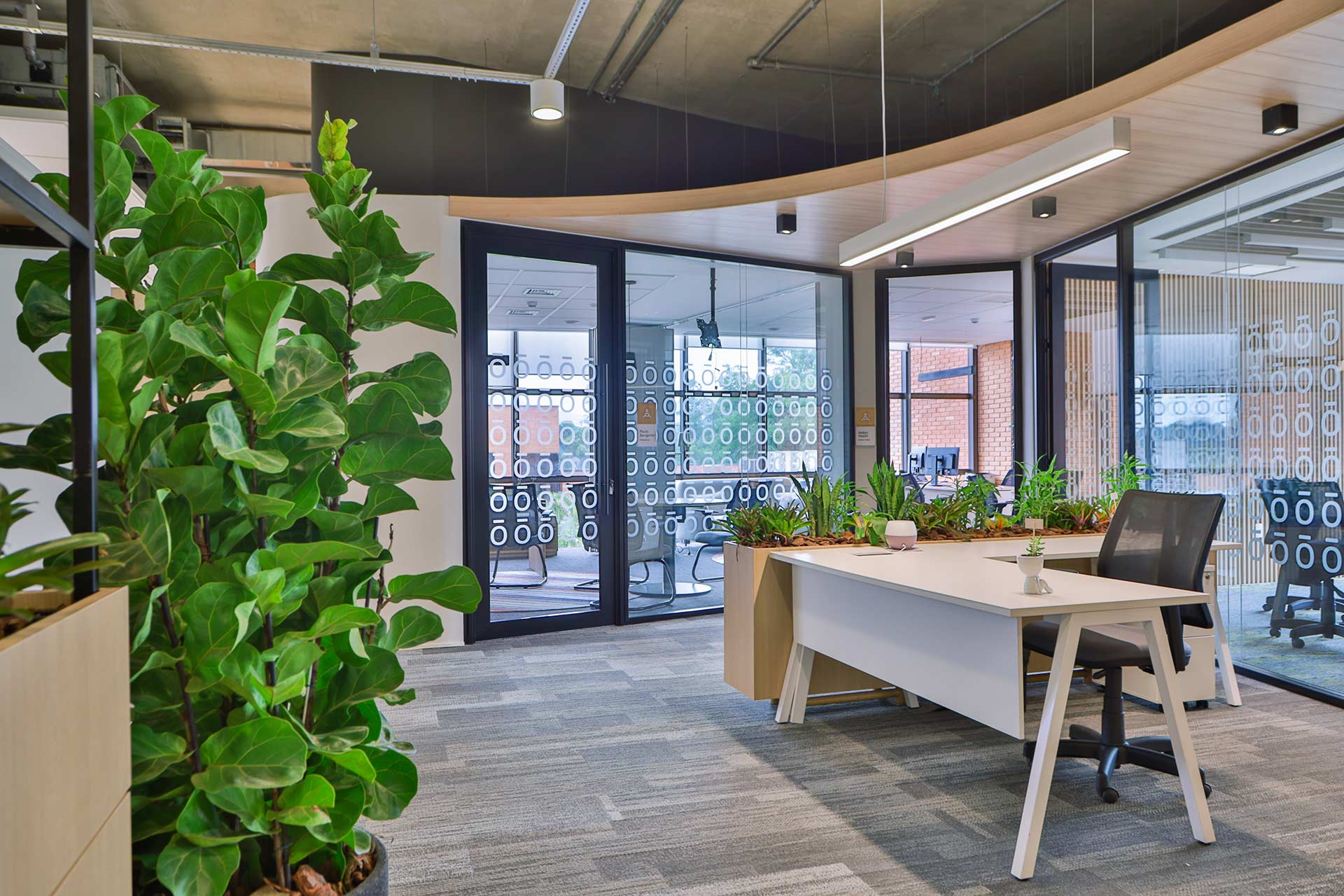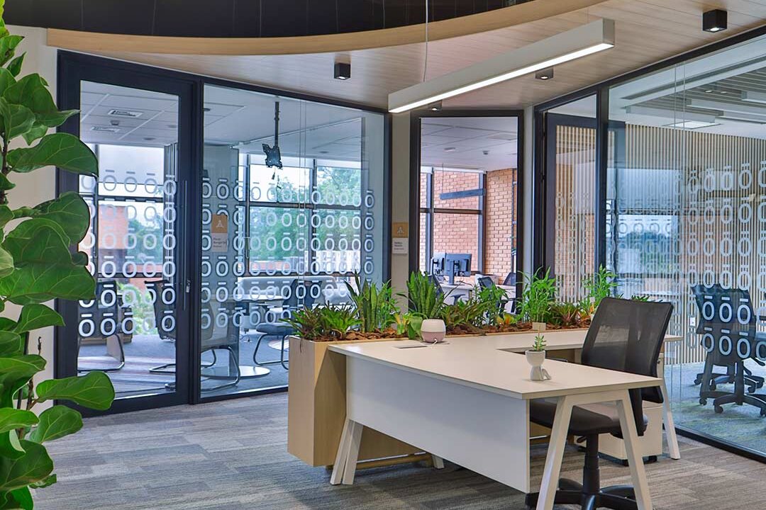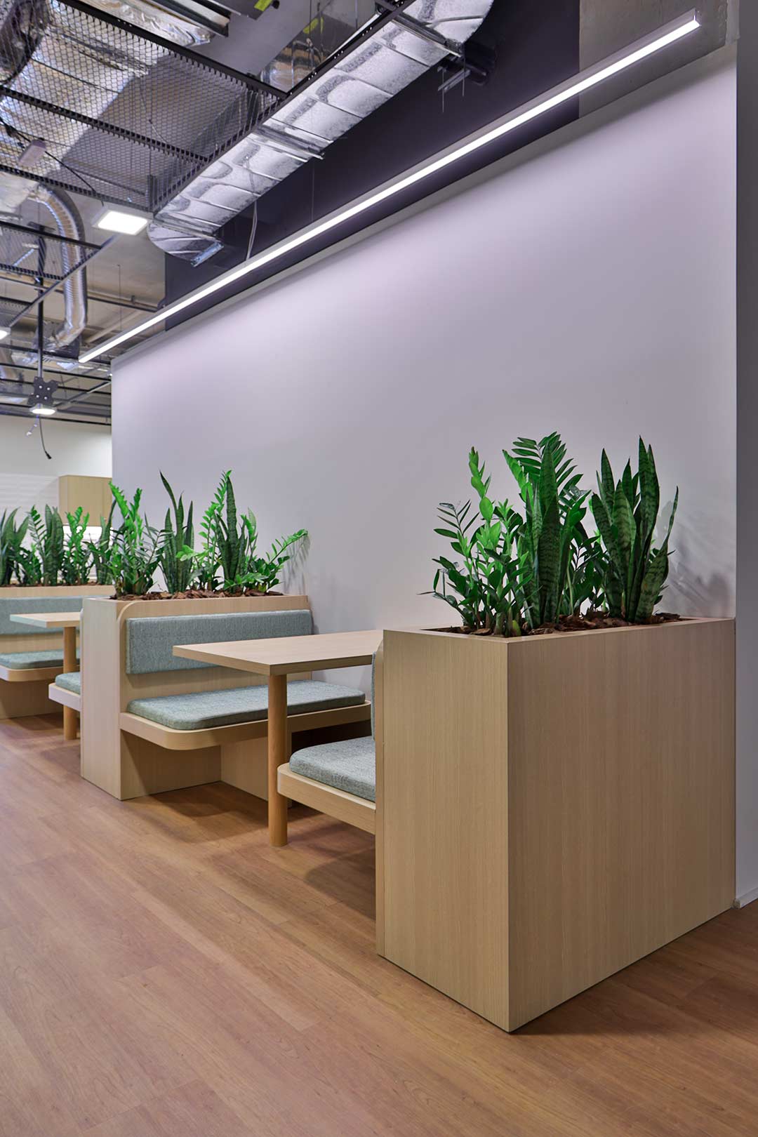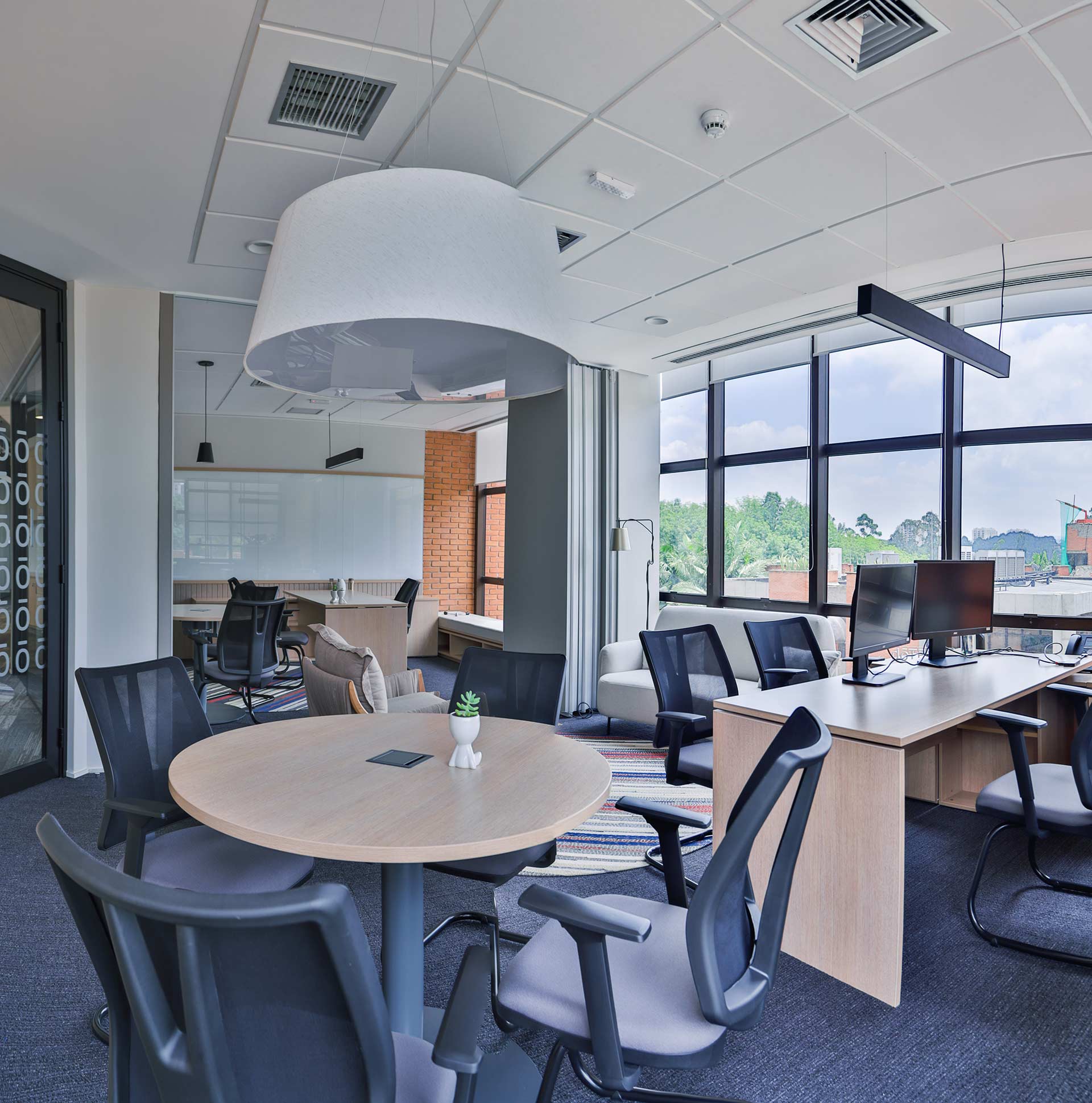Projetado pela Pitá e ocupando todo o 2º pavimento de um edifício rodeado pelo verde das árvores e jardins, o escritório da dōTerra se expande por uma área de 1150m² na região empresarial de Alphaville (Barueri/SP).