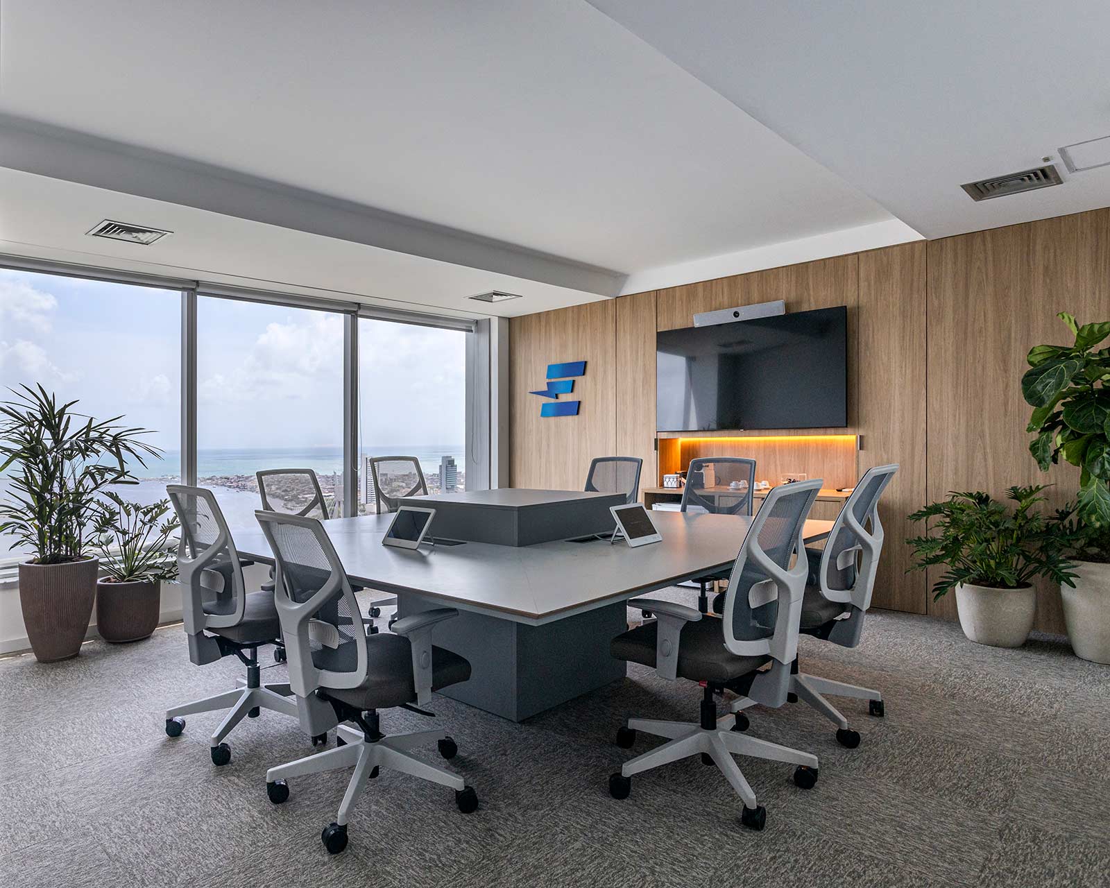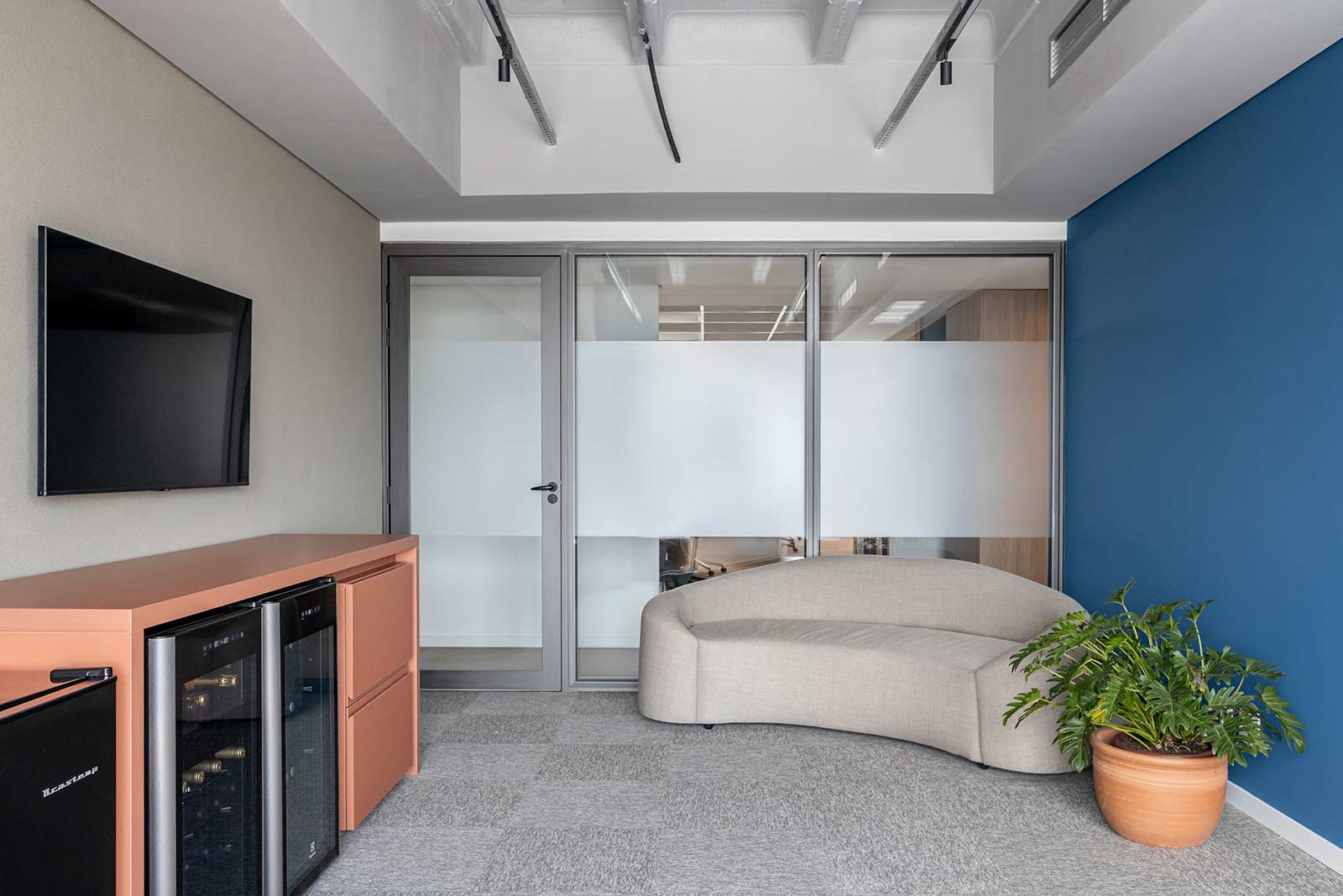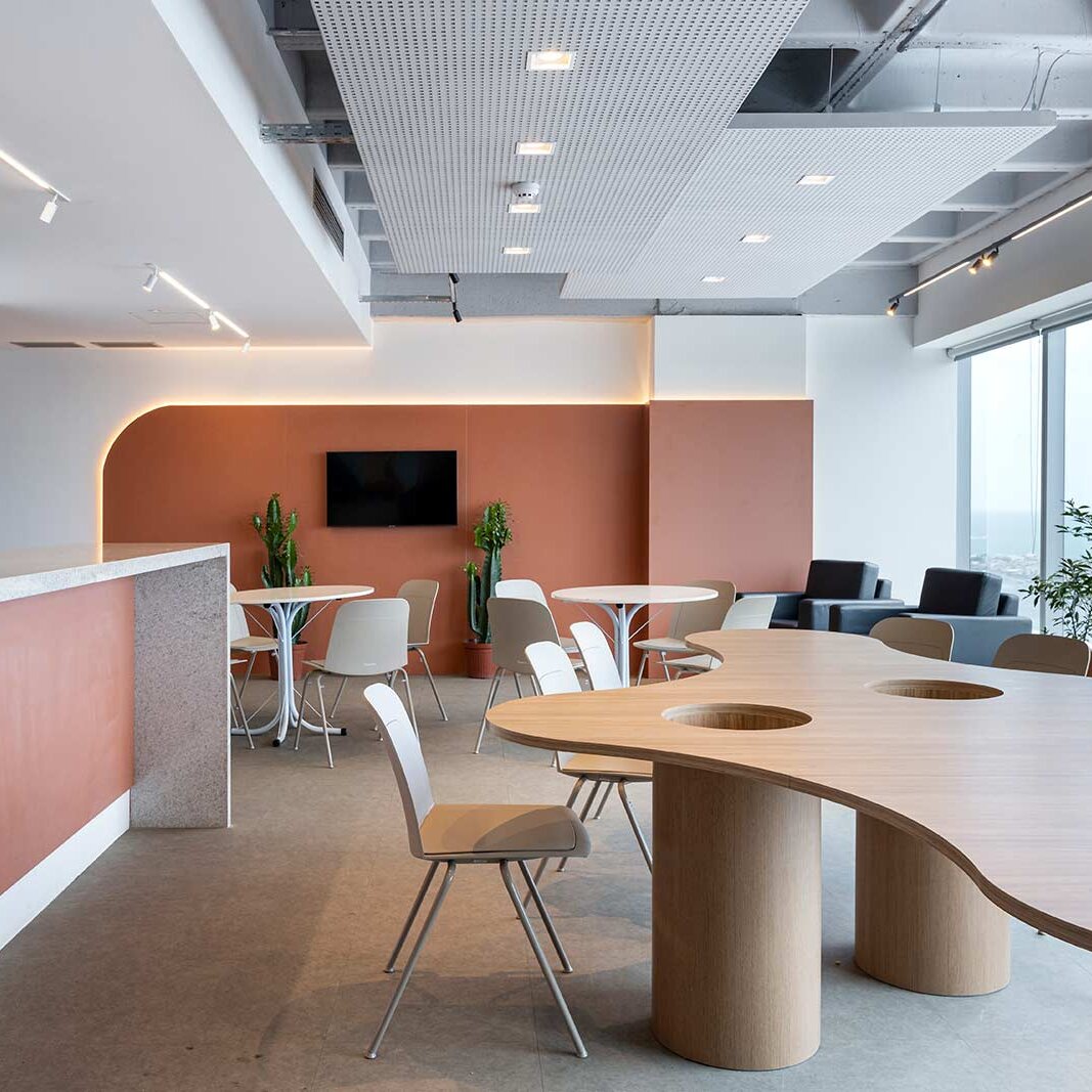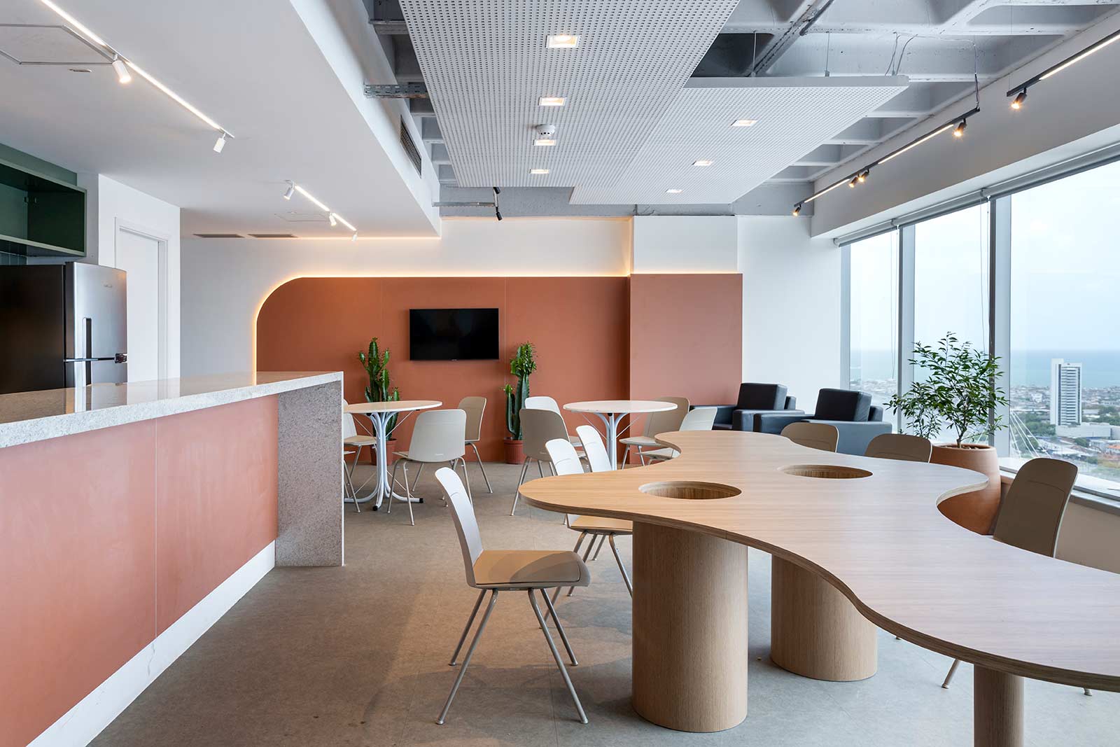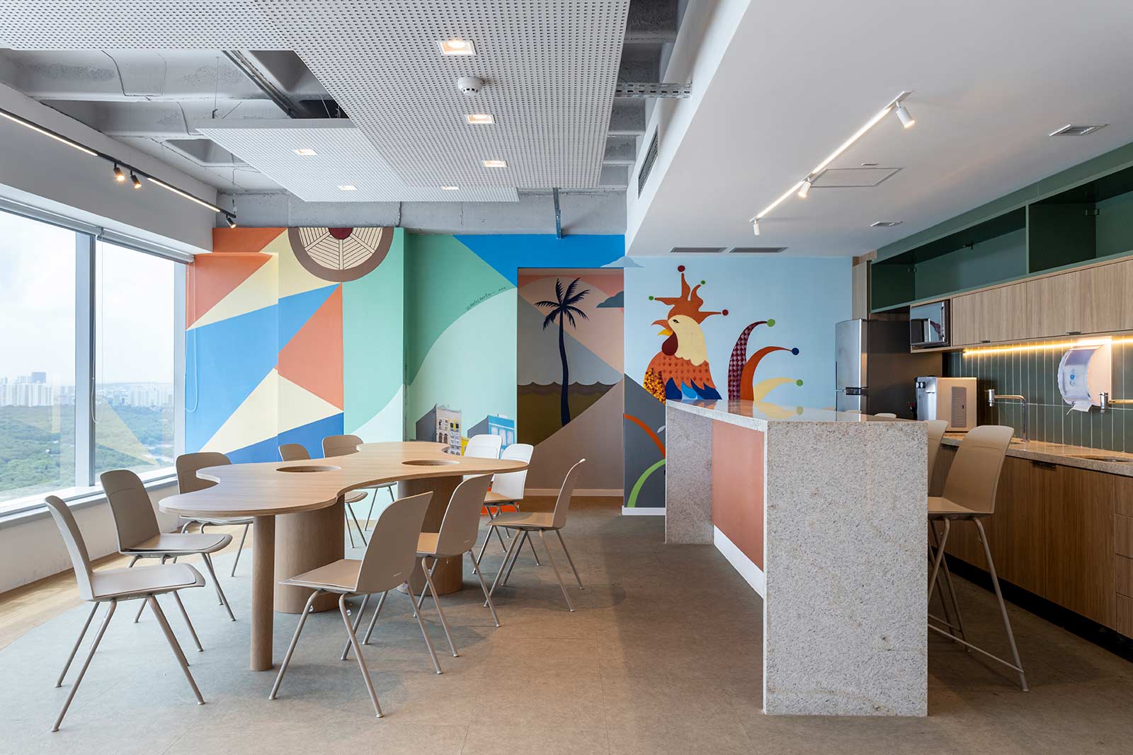 O destaque vai para a integração e a modernidade deste espaço, com suas cores vibrantes e design pensado para o bem-estar dos colaboradores.