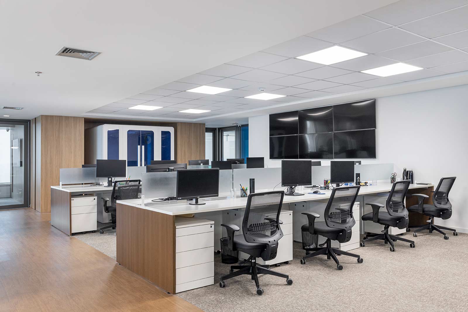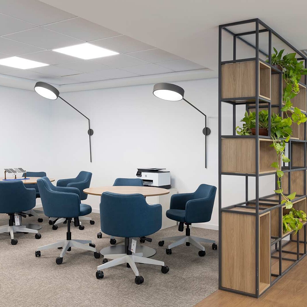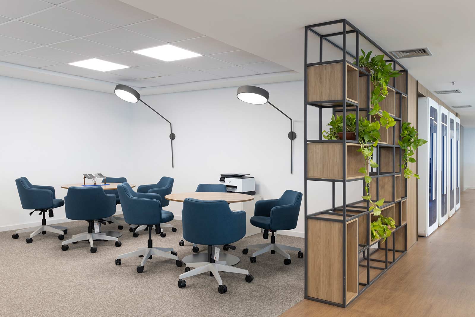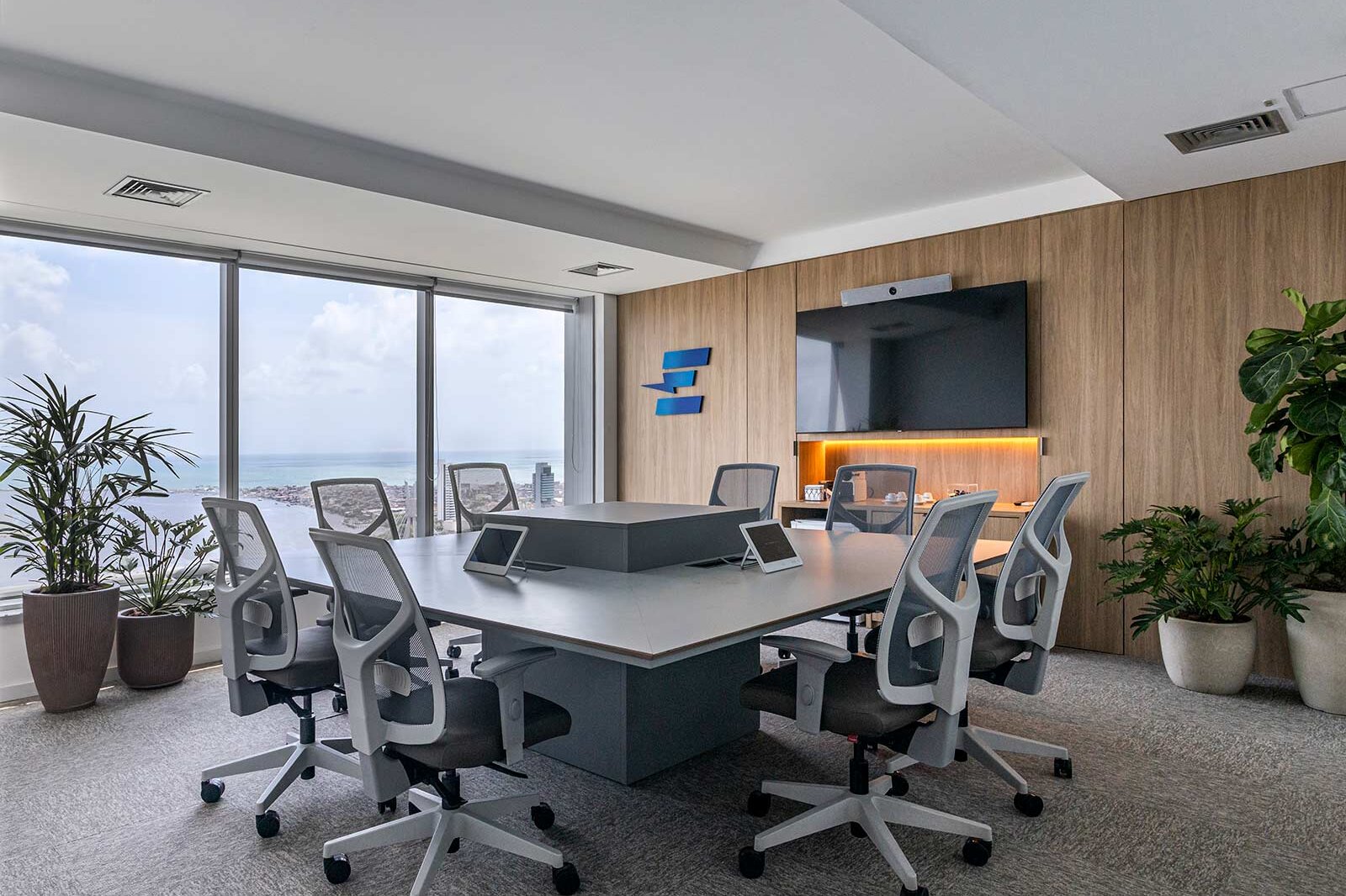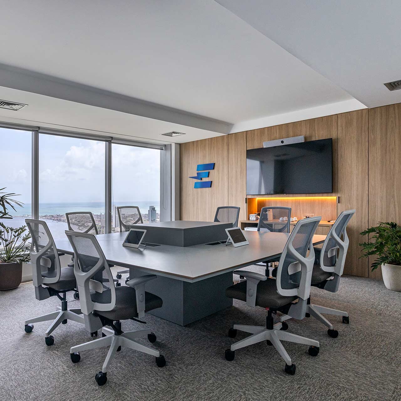 O destaque vai para a integração e a modernidade deste espaço, com suas cores vibrantes e design pensado para o bem-estar dos colaboradores.
