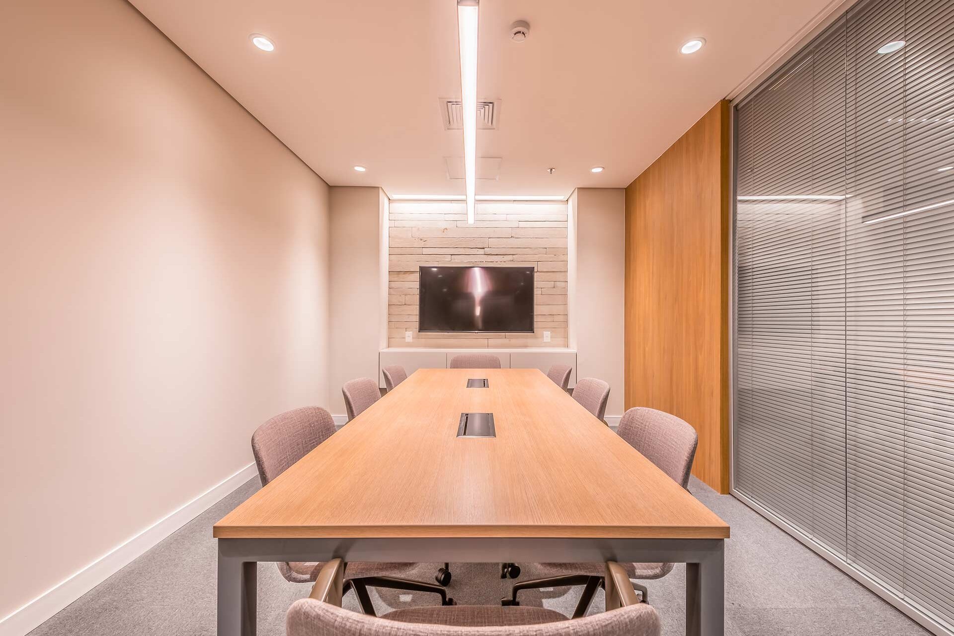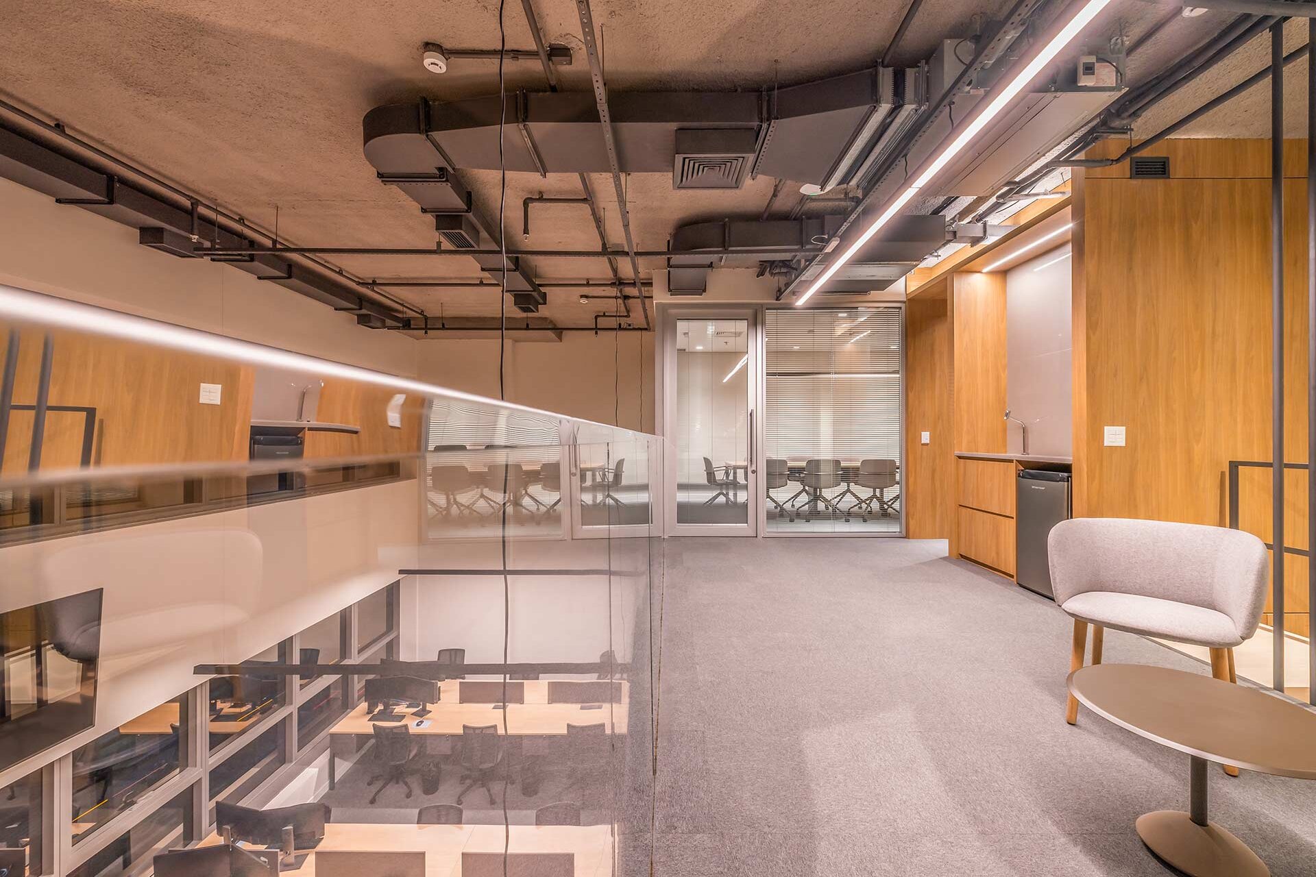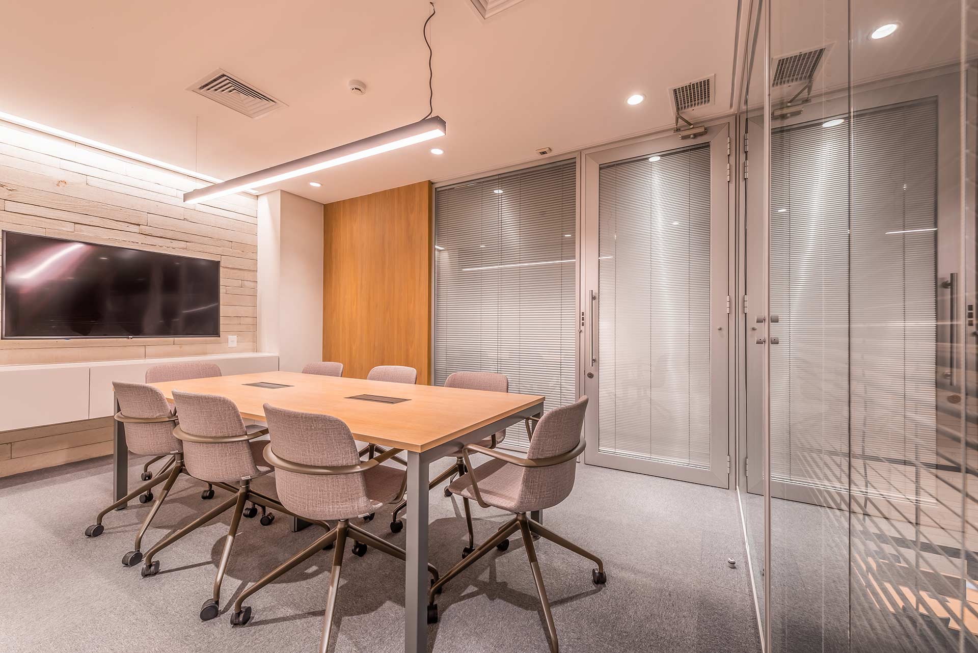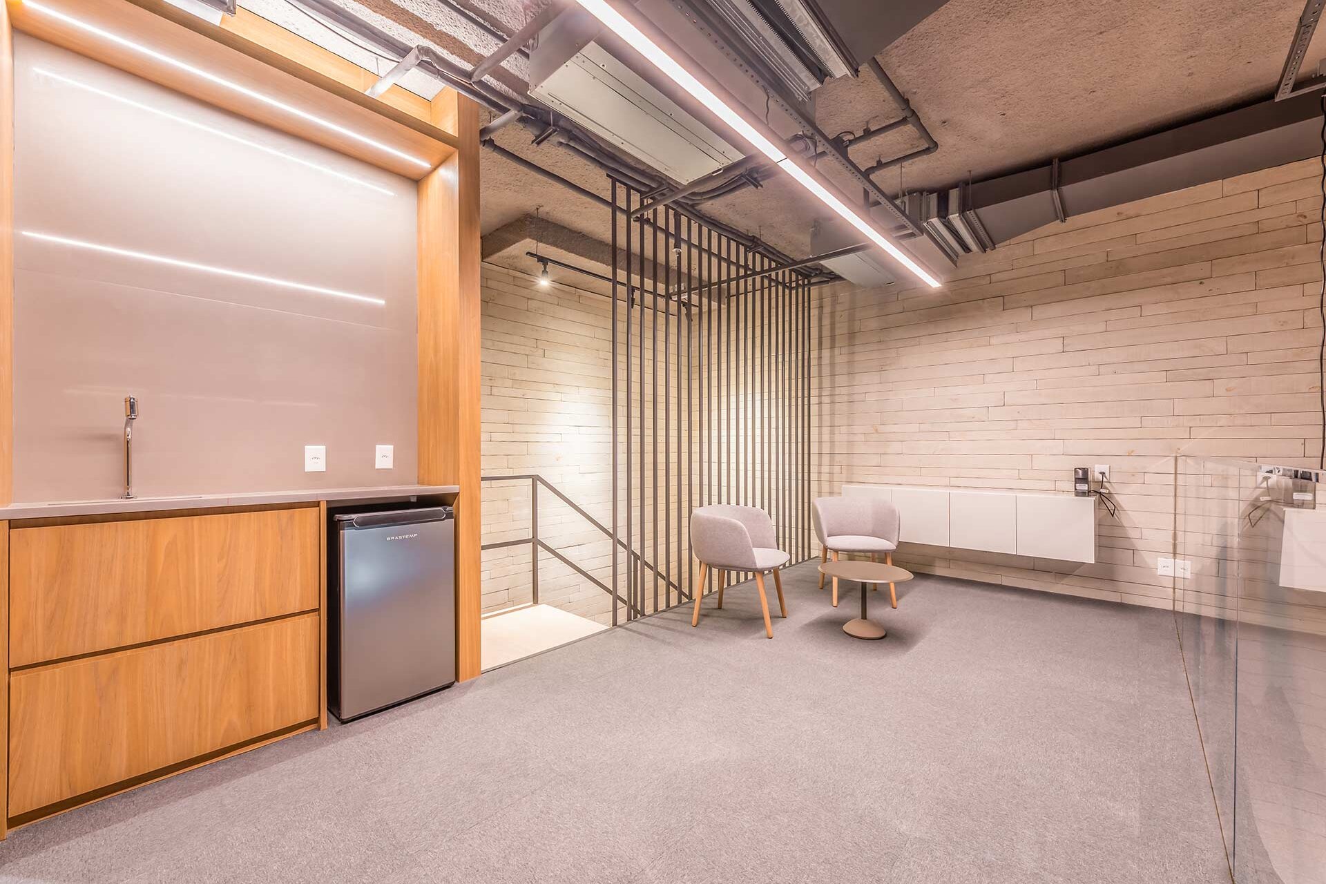 O projeto para os 180m² do escritório corporativo da MRU Invest no edifício DGN 360, em SP, foi desenvolvido pelo T3 Estúdio.