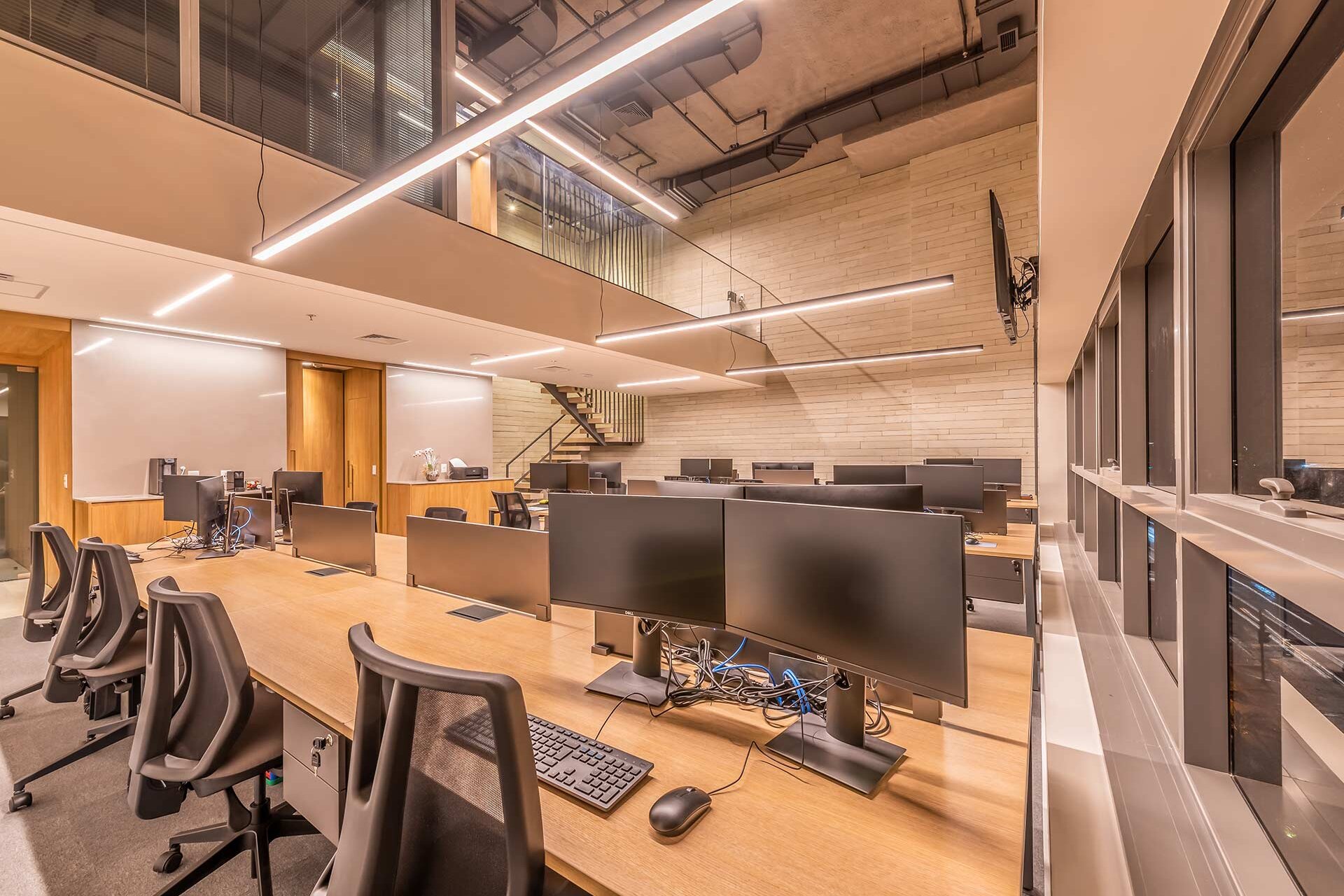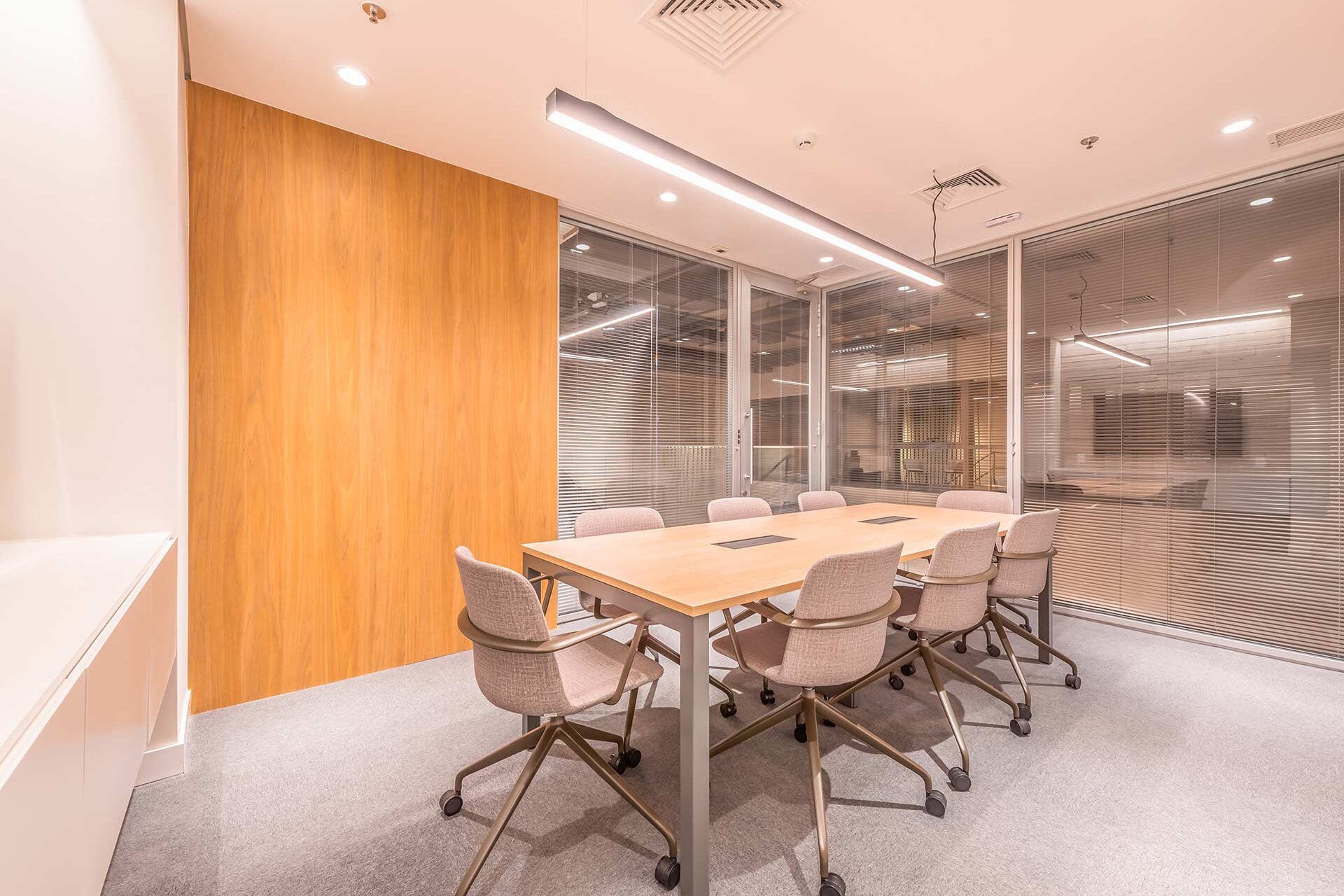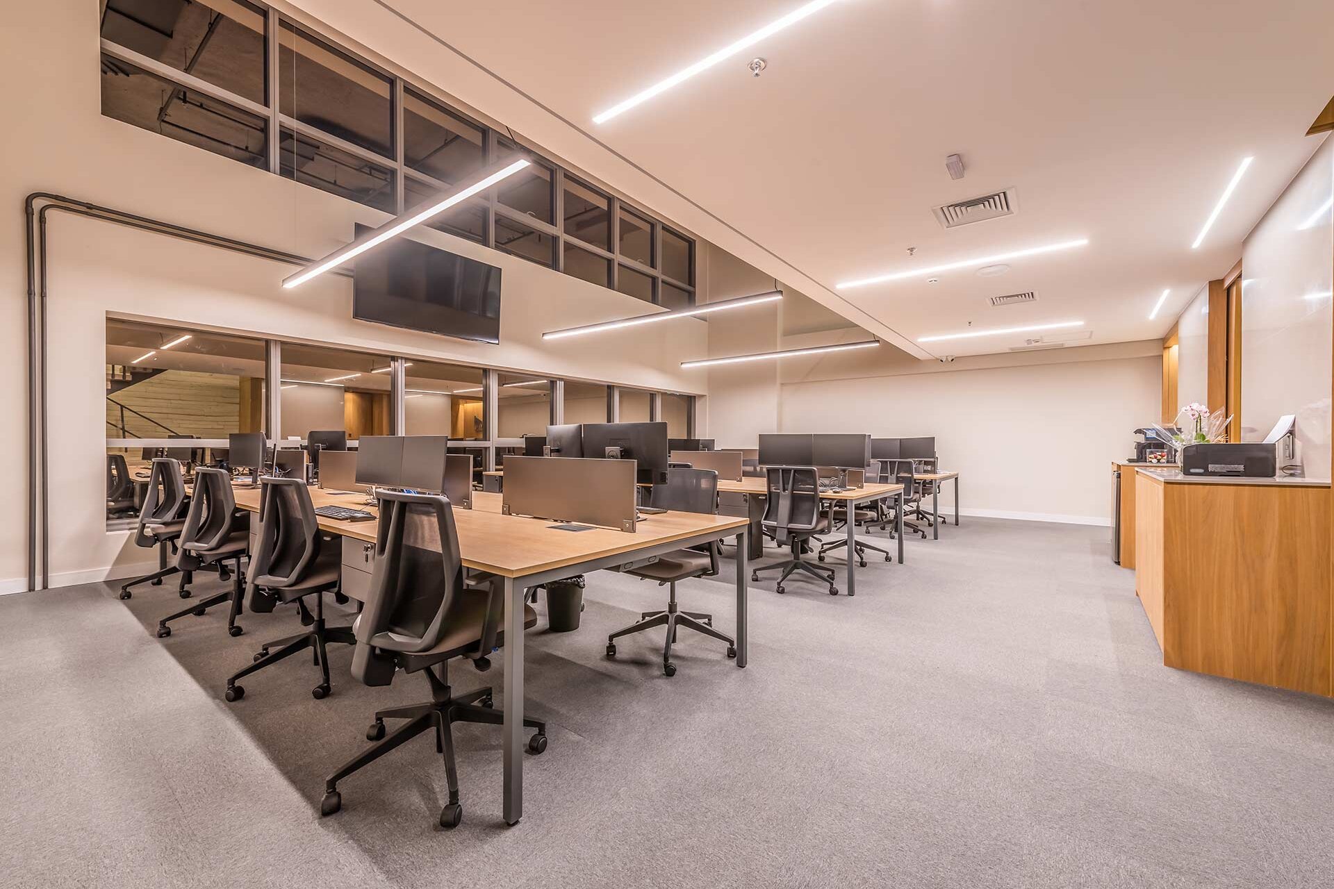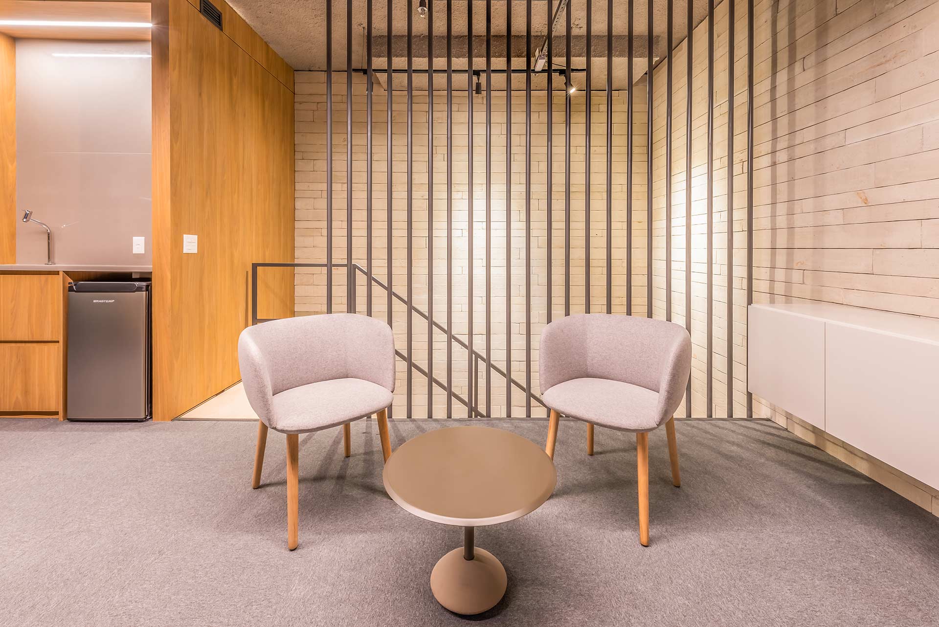 O projeto para os 180m² do escritório corporativo da MRU Invest no edifício DGN 360, em SP, foi desenvolvido pelo T3 Estúdio.