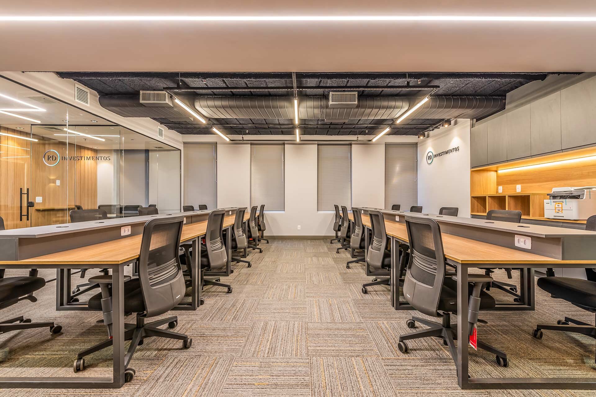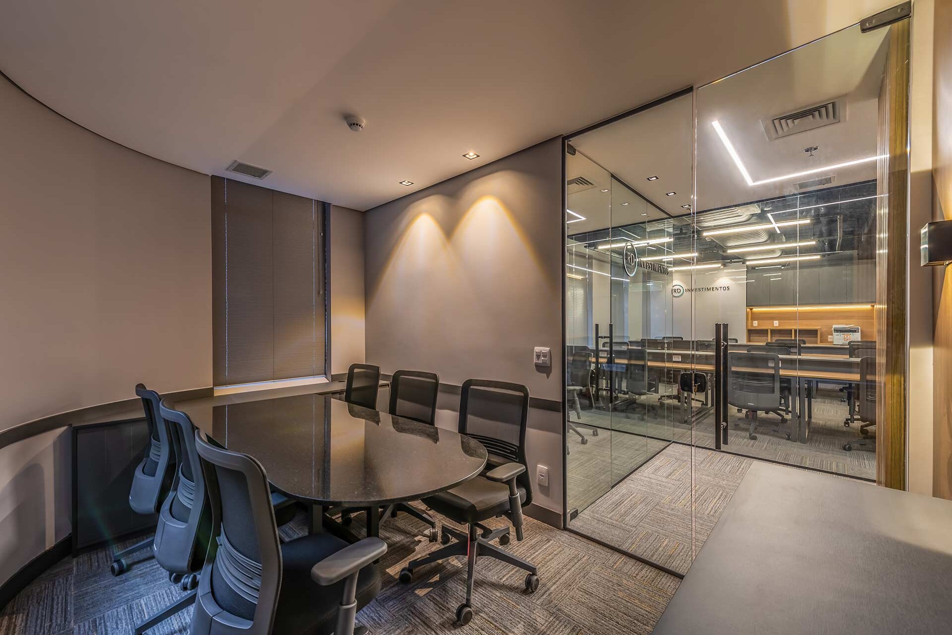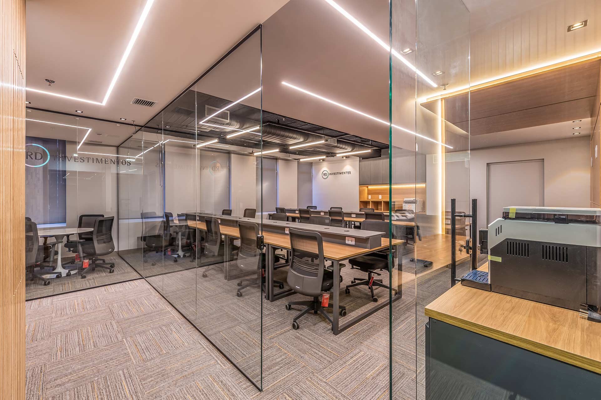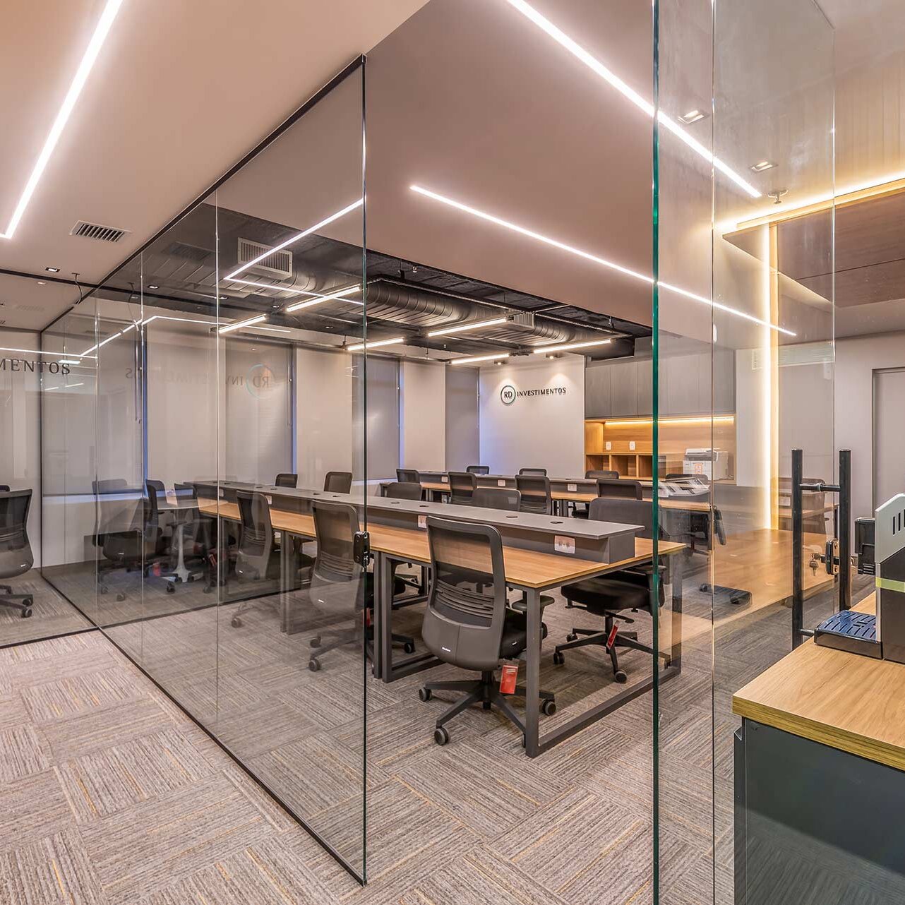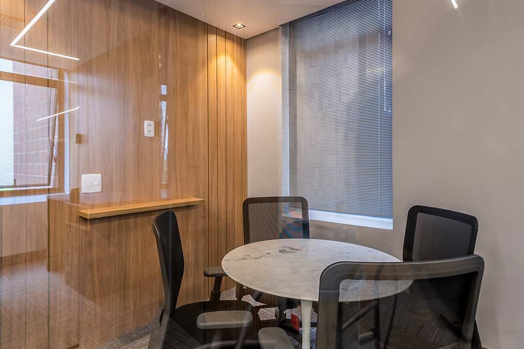 O projeto para os 105m² do novo escritório corporativo da RD Investimentos no edifício Hormino Maia, em SP, foi desenvolvido pelo escritório Matheus Duarte Arquitetura.